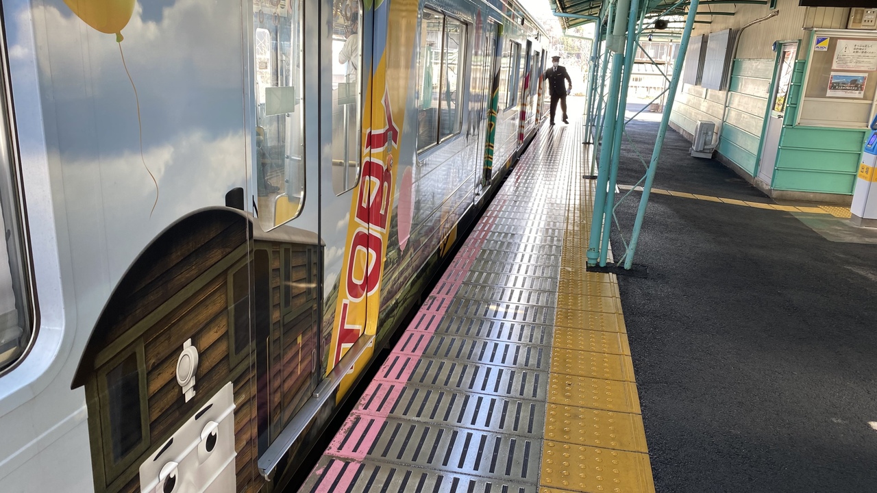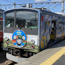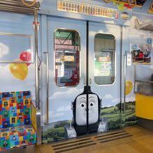 元JR東日本の山手線などで活躍した通勤電車がトーマスランド号としてラッピングされてます。車内もトーマス一色です。車内の張り紙やドアにもトーマスラッピングされて非常に派手な列車です。普通列車なので乗車券だけで乗れます。