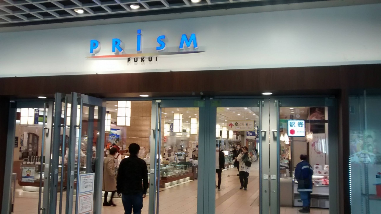 プリズム福井は、JR福井駅に直結したショッピングモールで、添付写真のように、明るくてクリーンな店内では快適な買い物が出来て、福井・北陸の特産品をゲットできます。日本ならではの施設・景色で、ほんとうにありがたいです。