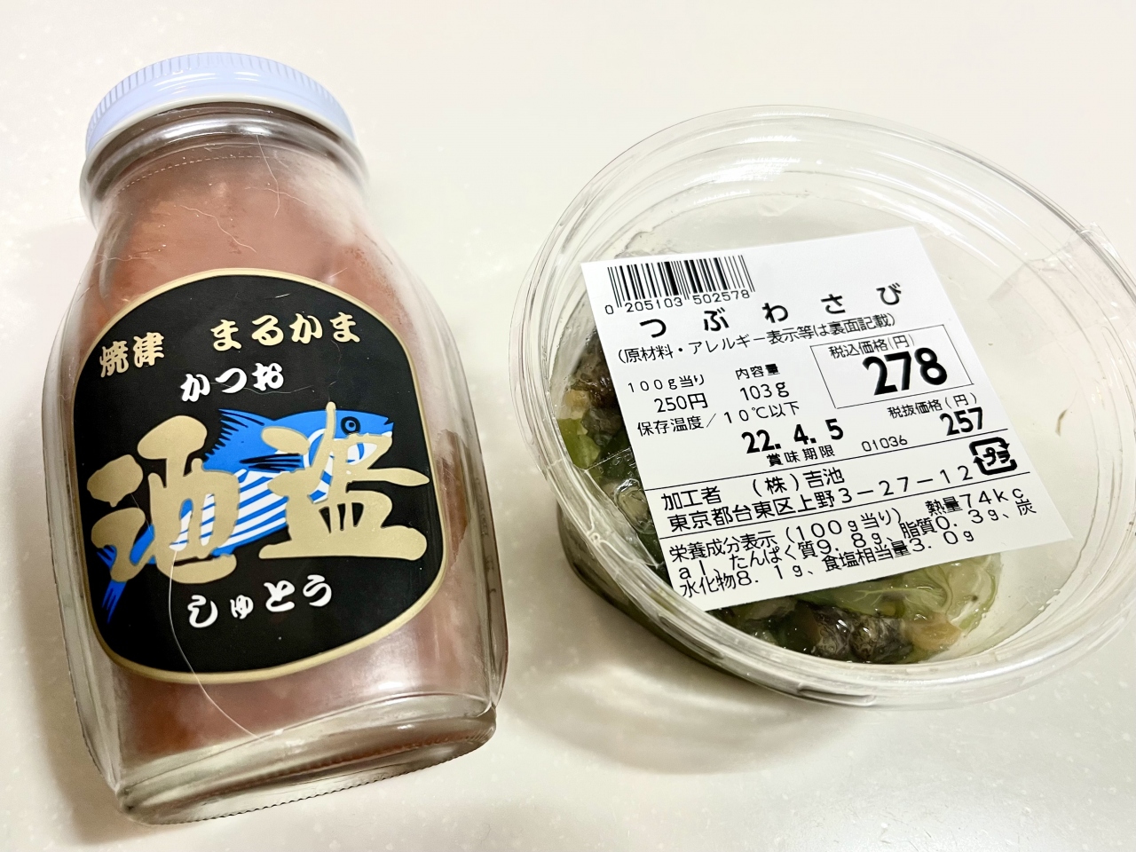 今回は地下一階で焼津産の酒盗とつぶわさびを買いました