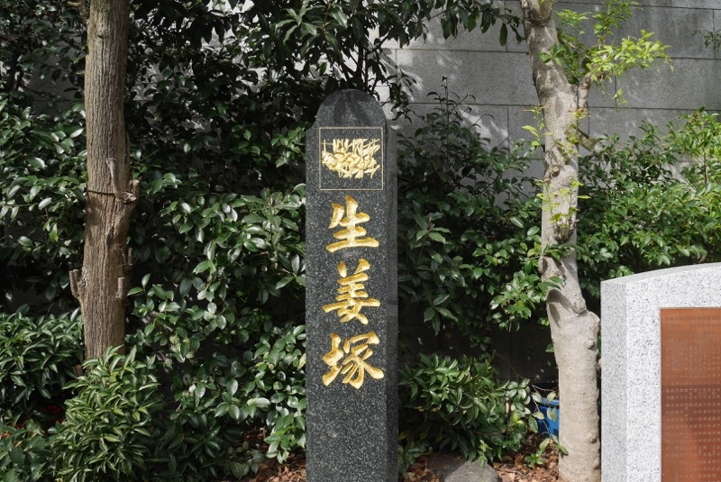 なにげに珍スポット!金色が塗り込められた生姜塚の文字、ならびに生姜のイラストが眩し〜い!このような食べ物の供養塔や塚は珍しくありませんが、たいていは生き物。植物でこのテのものはかなり珍しい!と思い思わず立ち止まってしまいました。昔、この近辺には生姜畑がたくさんあったそうです。