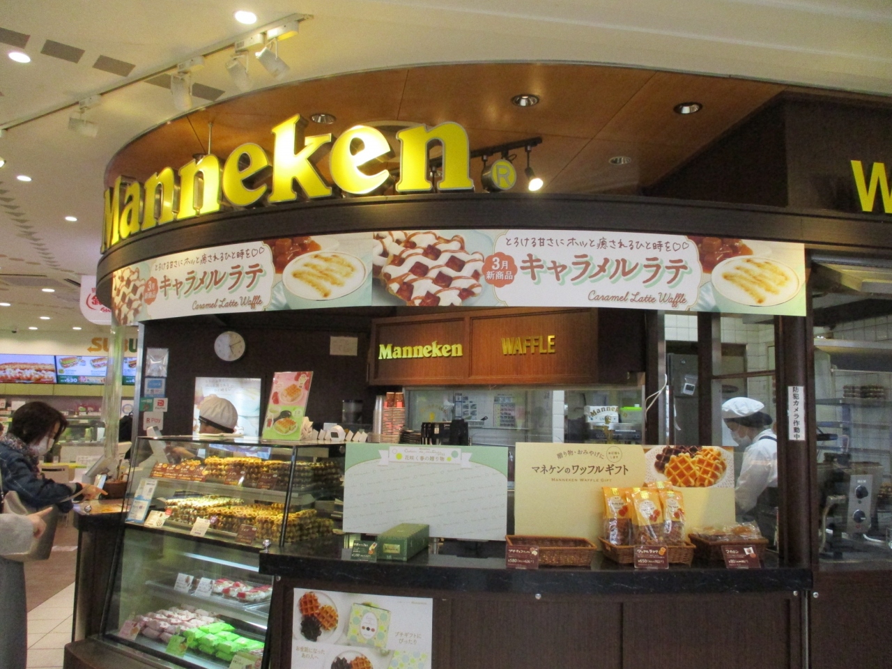 JR高槻駅の改札近くにお店があります。人気のワッフル店です。定番のワッフル以外に月替わり商品もあります。3月はキャラメルラテでした。あとワッフルラスクやマカロンも売られていました。いろんな味が楽しめます。