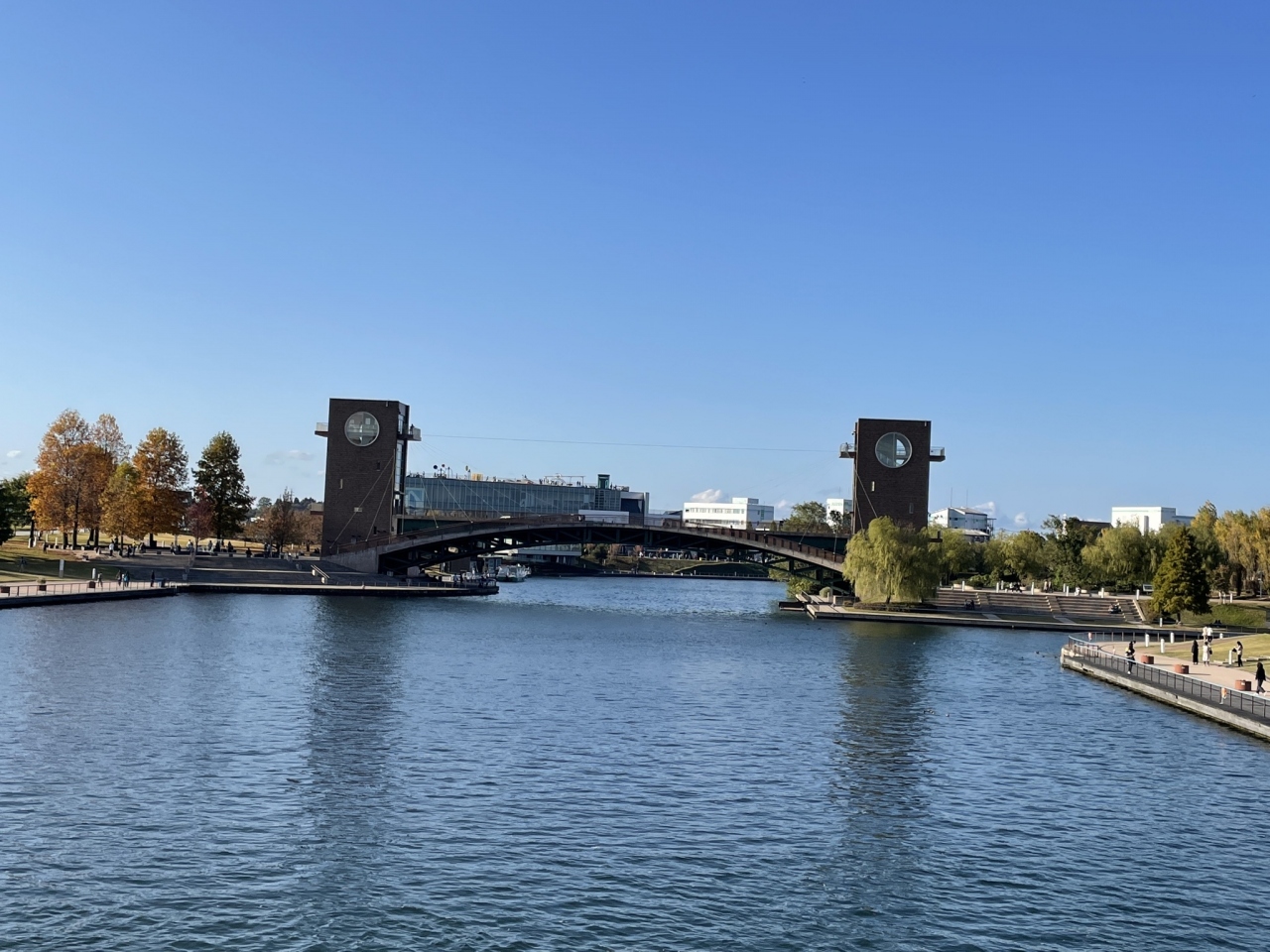 富山駅北口にある大きな公園です。昔は木場があって木材を運んだりした運河だったそうです。公園化するにあたって運河の先には関門があり、遊覧船で見学ができるみたいです。一番目立つ大きな橋の2つの塔の上には、ロープの糸電話でつながっており、双方から会話ができました。