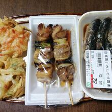 で選んだのが、ねぎま(150円)2本、自家製いわしの甘露煮(252円)、やさいのかき揚げ(80円)、桜えびのかき揚げ(110円)。プラス消費税がかかります。