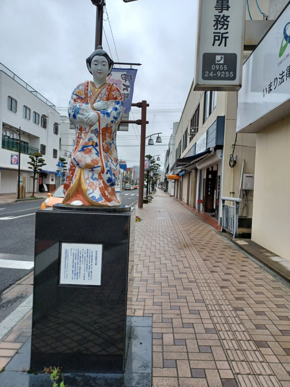 伊万里駅を出て、伊万里川方向に向かう道の途中にある古伊万里人形です。道の片側に伊万里焼の女性の人形が1体づつあります。