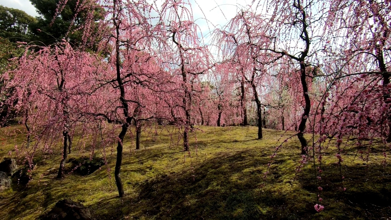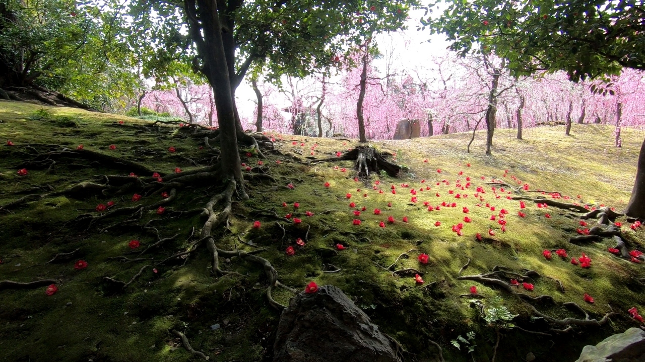城南宮は、伏見区中島鳥羽離宮町で、国道一号に面する西側入り口の鳥居があります。こちらには参拝者用の駐車場が用意されていて参拝が便利です。城南宮は、「方除の大社」として知られていて、以前我が家を新築した際にはお札を頂きに参拝しました。社殿の西に広がる「春の山」では、150本のしだれ梅がうすべに色や紅白の花で、春の訪れを楽しむことができます。今回は家内のリクエストで、ここのしだれ梅を見学するために訪れました。平日でも私が思った以上に多くの観光客で賑わっていました。また苔のじゅうたんに落ちてそのままになっていたボタンの花がとてもきれいで感動しました。