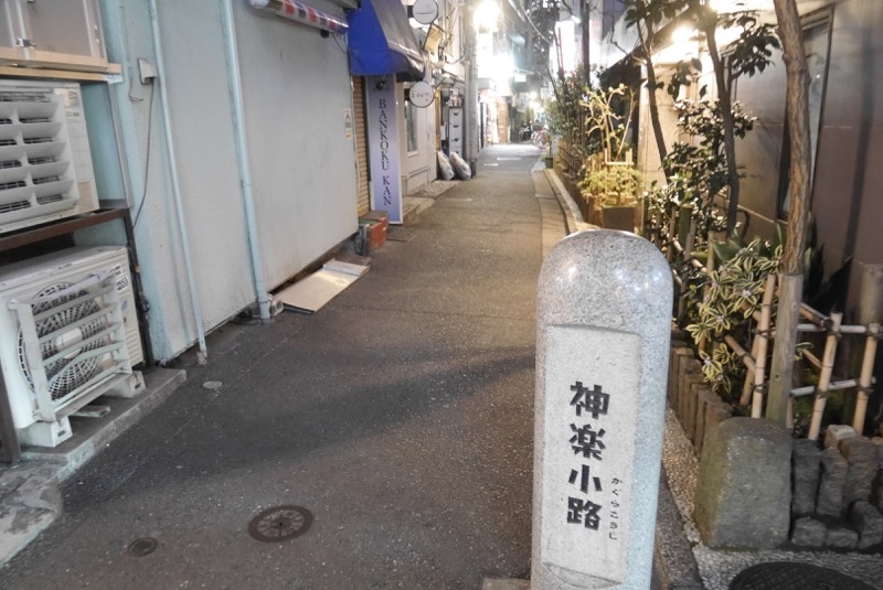 神楽坂周辺に多々ある、名前つきの道のひとつです。小路、とついている通り道幅は狭めで、また、坂でもないです。歩き旅だからこそ楽しめる、ぶらぶらしたくなる道。お店の明かりと、路地裏ならではの薄暗い感じが雰囲気たっぷり。ドラマにでてきそうな場所でした。