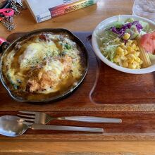 焼きカレーで有名な店ということで、ランチに訪れました。ランチメニューの白身魚フライと照り焼きチキンの焼きカレーをお願いしました。サラダとドリンクも付いてきます。カレーの中に白身魚フライと照り焼きチキンが埋まっており、上に伸びるチーズがかかっています。人気店なので、いつも混んでいるようです。