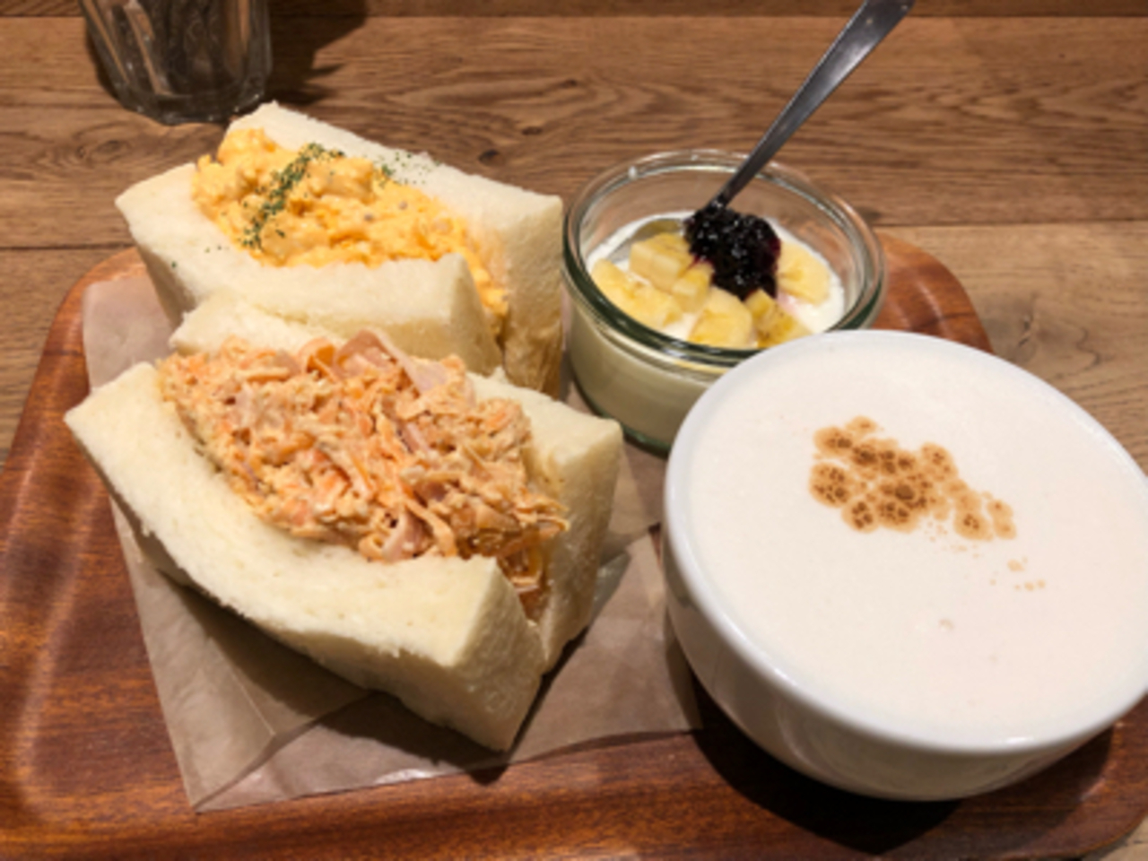 浅草の有名なパン屋「ペリカン」の食パンを使っていて、棚に食パンが並んでます。ふわふわもちもち食感がたまらなく美味しかったです。カフェラテとヨーグルト付きのサンドイッチランチプレート1100円でした。朝から贅沢できました。