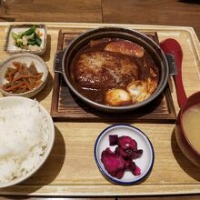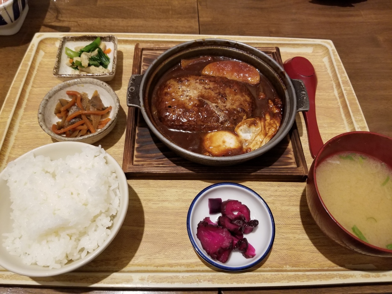 ランチタイムに同僚と一緒に訪れた。明太子、ご飯、味噌汁がお代わり自由だ。ハンバーグはそれなりに大きくて美味しい。明太子は多少形が崩れているが美味しい。味噌汁は優しい味だ。