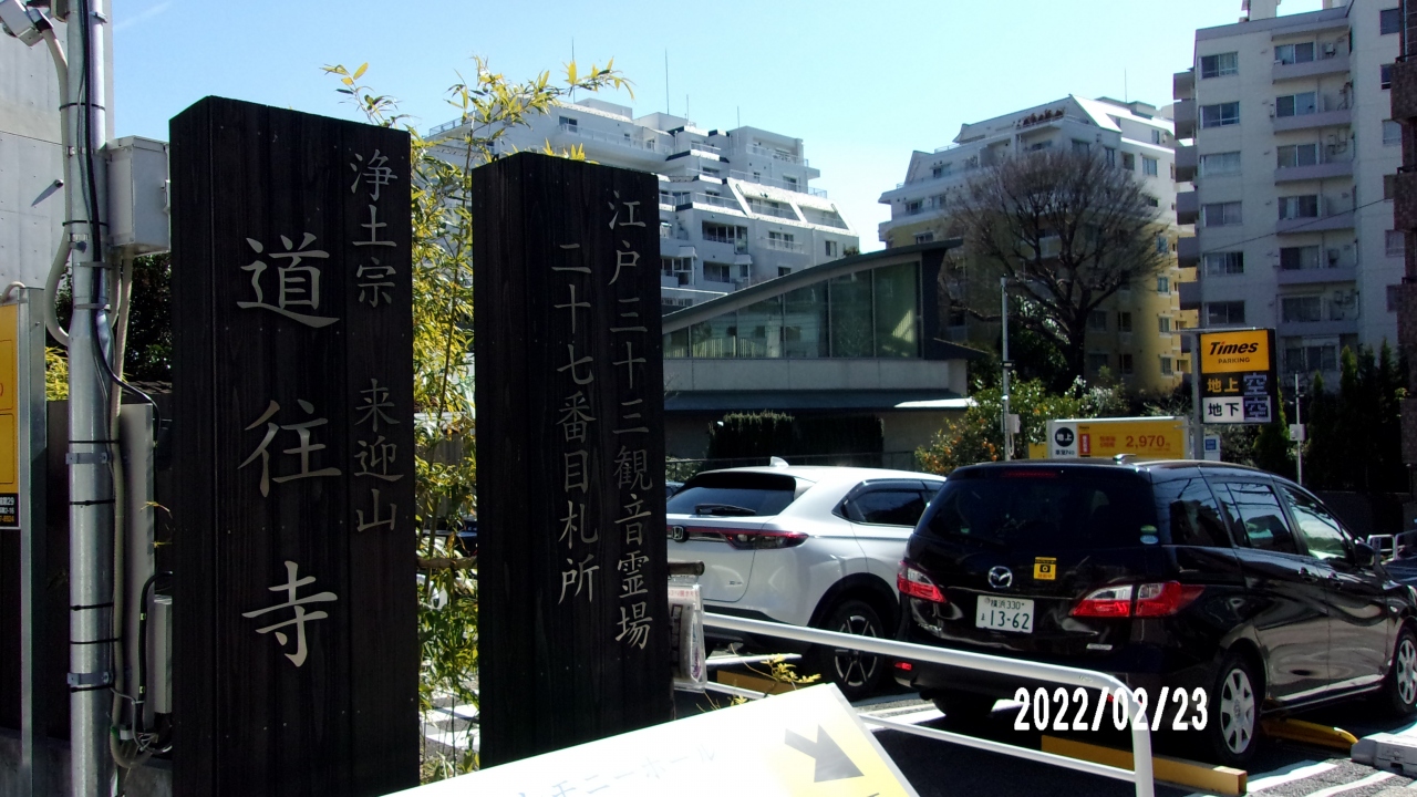 この来迎山道往寺は伊皿子坂の途中にあります。地下鉄都営浅草線泉岳寺駅から北に5分強の場所にあります。本堂は大きな会館の建物の中にあります。斜面を利用しての境内ですが庭園などもあり地を生かしています。この寺は1600年に創建された浄土宗の寺です。
