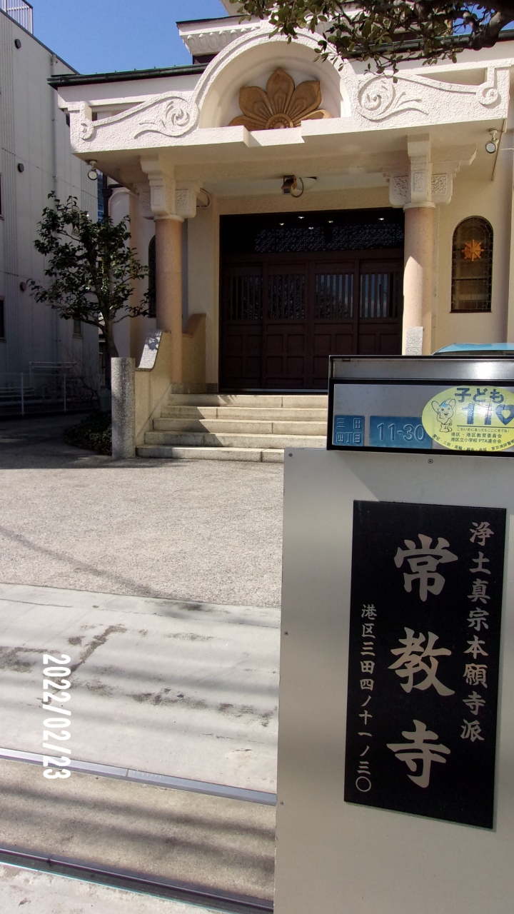 この常教寺は高輪の二本榎通りが聖坂という名称になる通りに面しています。地下鉄東京メトロ南北線白金高輪駅から東に10分強の場所にあります。この寺は16世紀末に大森で創建された浄土真宗本願寺派のものです。明治時代初期に今の場所に移築しています。コンクリート造りです。本堂は日本的ではなくインド的な印象です。