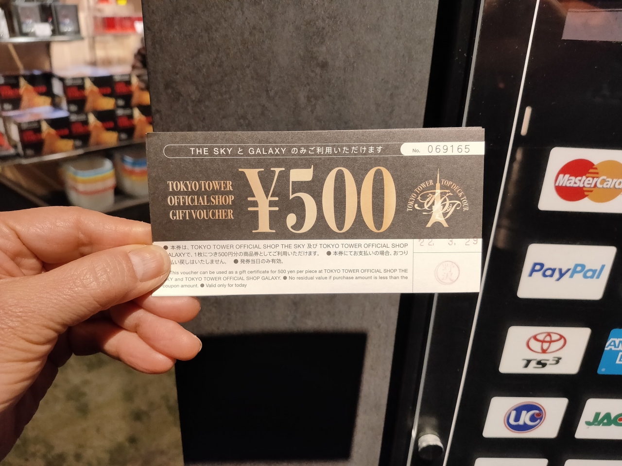 メインデッキまでエレベータで上がると当日500円のクーポンが貰えました。東京タワーのメインデッキや地上階でお土産等が買えます。