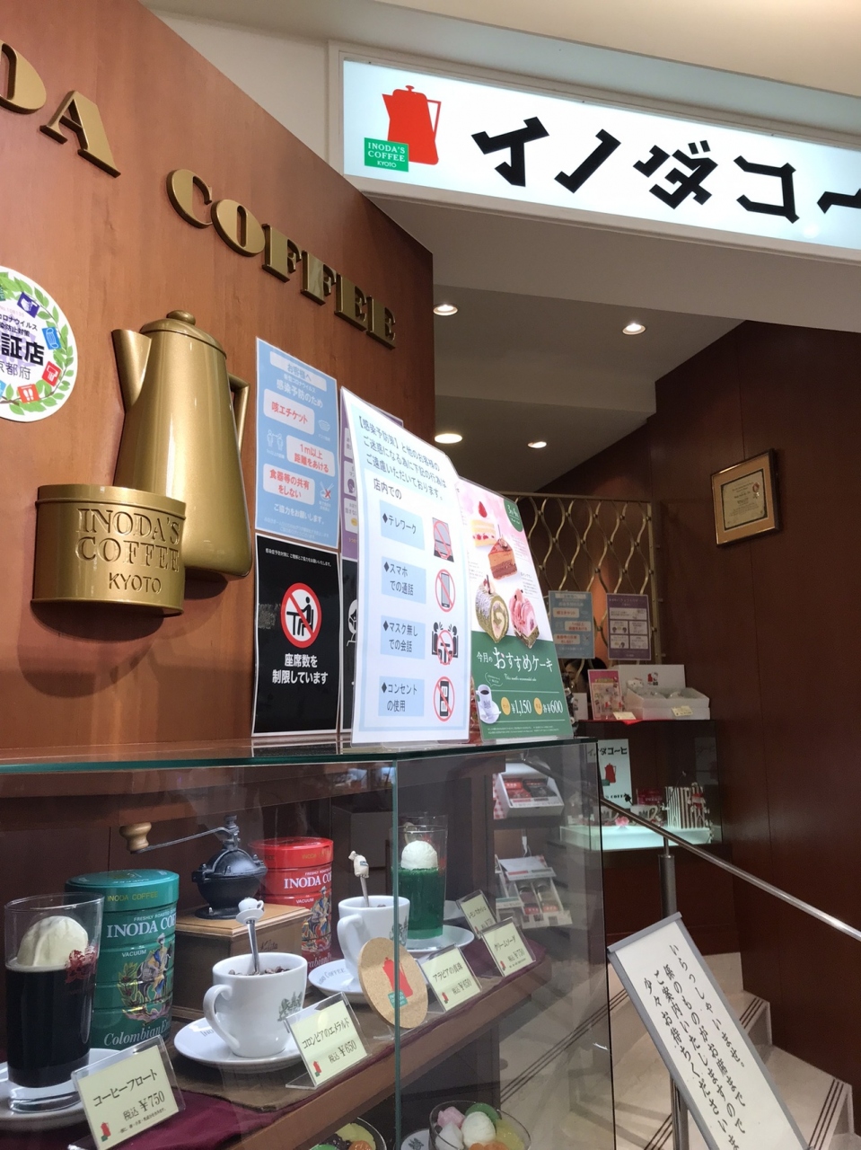 京都大丸に直結するイノダコーヒーです。入り口は小さいですが、ちゃんと壁にお店のシンボルのコーヒーポットとコーヒーカップのオブジェがあります。ケーキセットは1100円とお高めですが、カフェショコラは、クリームがたっぷりで甘さ控えめがいいですね。年齢層も高く落ち着きます。