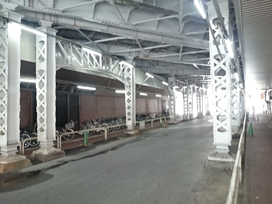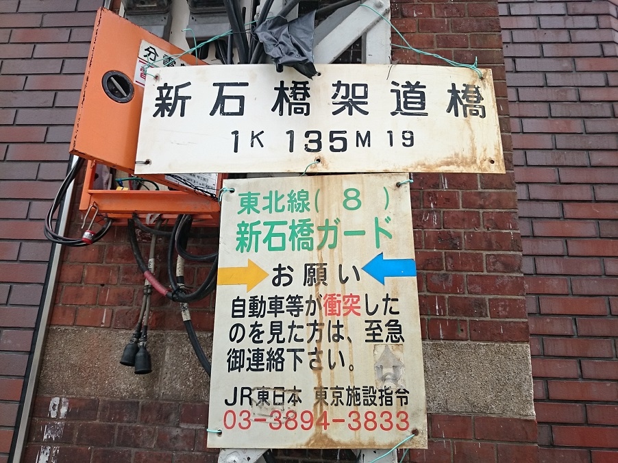 架道橋とは道路や線路の上をまたぐように架かっている橋の事で、新石橋架道橋はJR神田駅東口前の道路をまたいでいるJR線路の橋です。線路は8本通っていて、線路により架橋の年代は異なりますが、最も古い中央線の架道橋は大正8年(1919年)の架橋だそうです。大正時代の橋が関東大震災や東京大空襲にも耐え現役で使用されているとは驚きです。