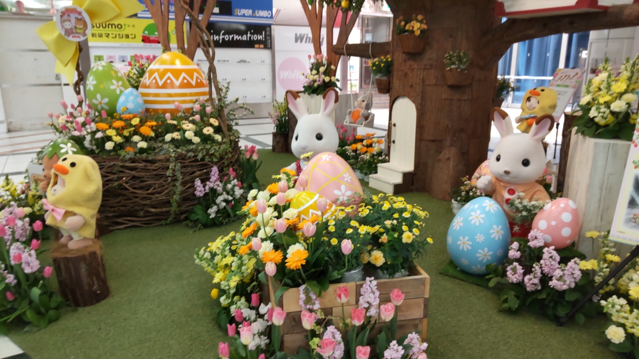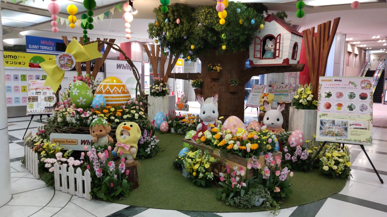ホワイティうめだは、阪急梅田駅の近くの地下にある商業施設です。2022年3月18日から5月8日まで、「シルバニアファミリー×ホワイティうめだ Flower Forest スプリング」が開催されています。3ヶ所でかわいいシルバニアファミリーのぬいぐるみが飾られています。サニーテラスは、イースターです。子供から大人まで楽しめるスポットです。日頃の小さなシルバニアファミリーと異なる大きな人形と記念撮影をされては如何でしょうか。