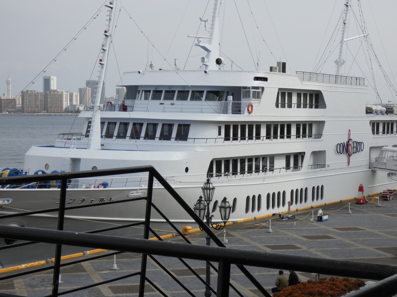 人気スポット神戸ハーバーランドUMIEモザイクの横から神戸ベイクルーズに出航する白色の美しい船体の船・コンチェルト。ランチクルーズやディナークルーズをやっていますが遠くから近くから美しい船体を眺めるのも良いですね。子供たちがクルーズに出かけました。