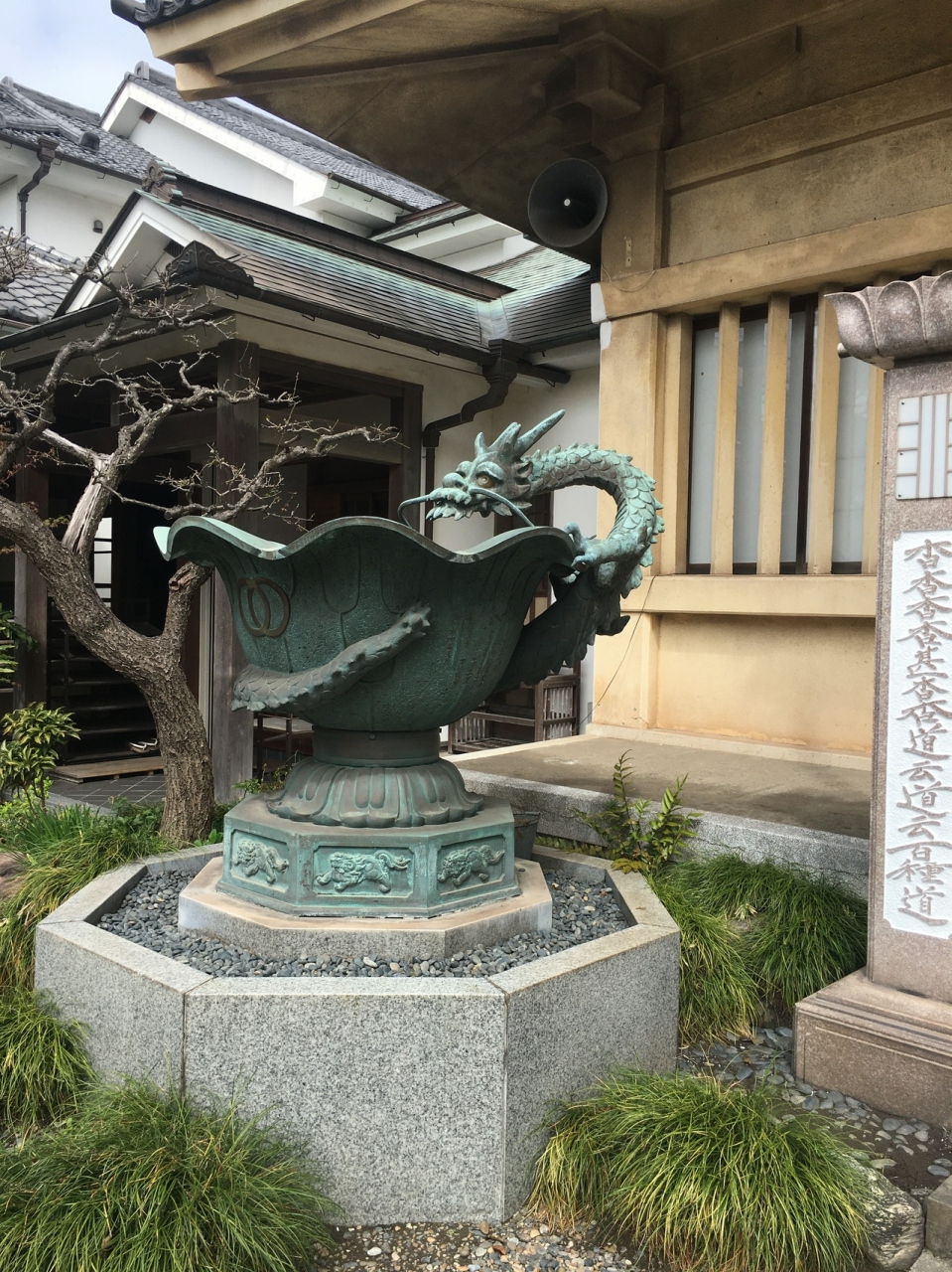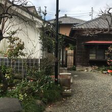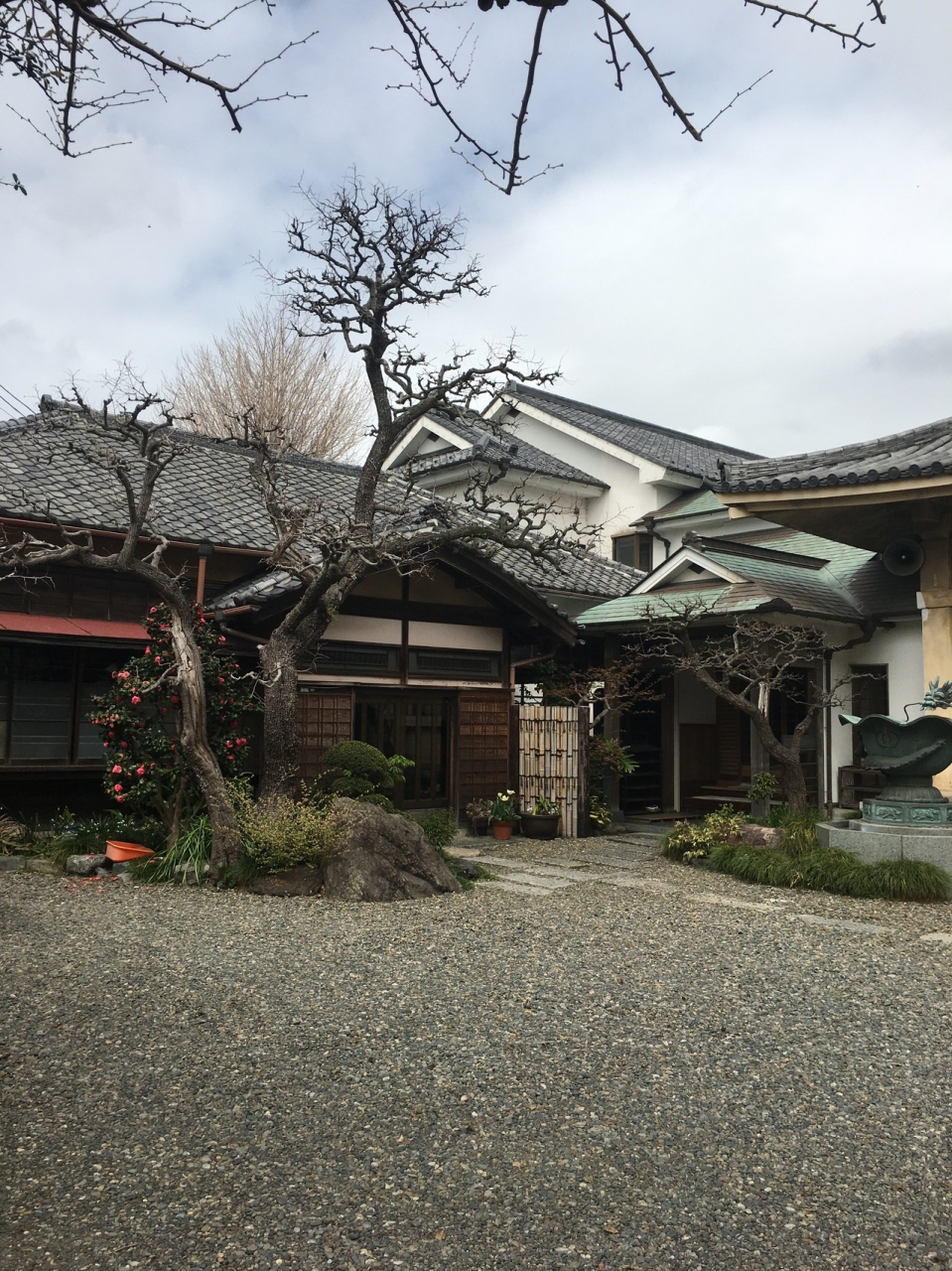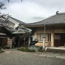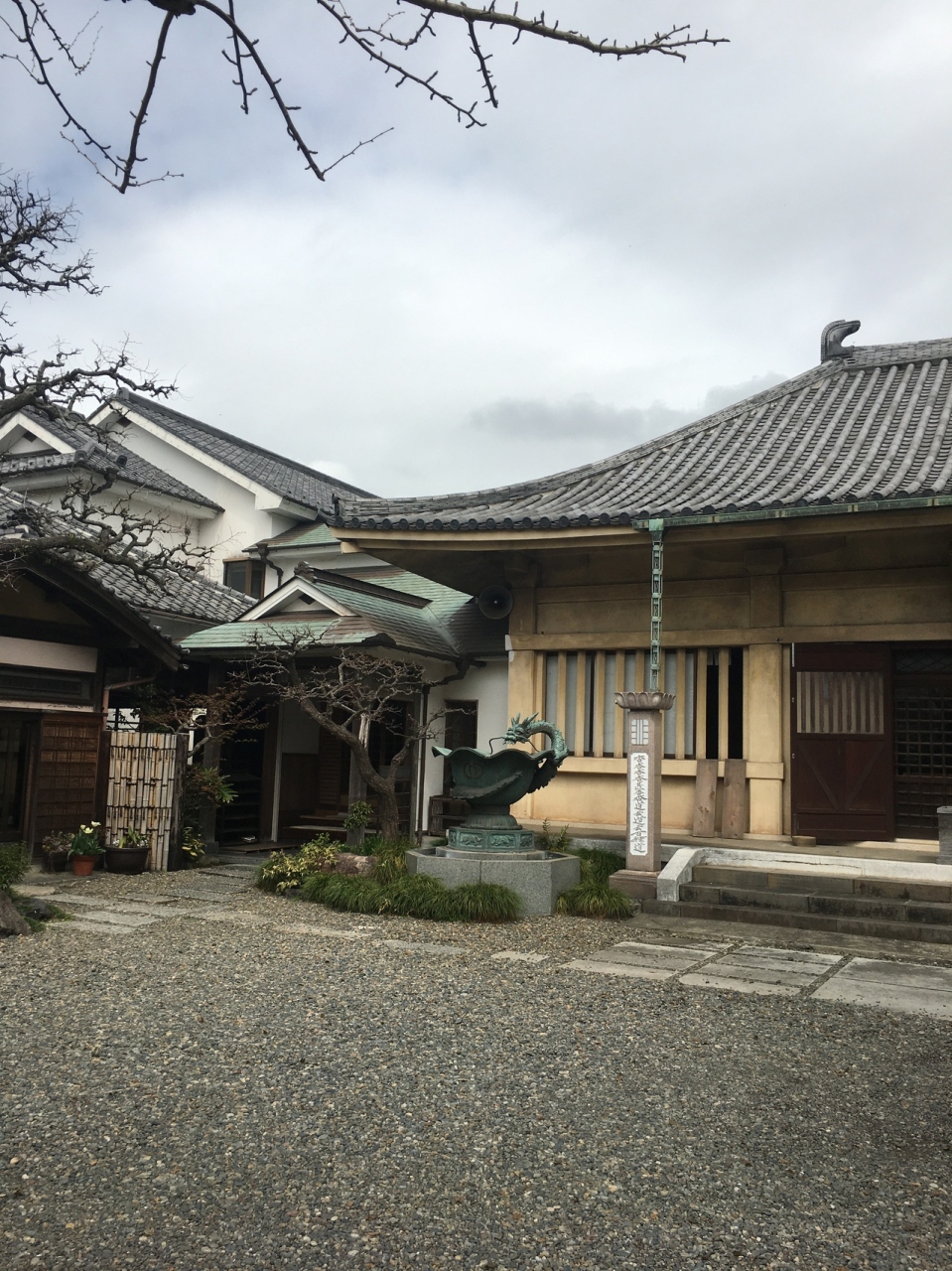 境内入ると石の道が本堂まで一直線に伸びていて左右は砂利で、本堂の前にも砂利がひいてありました。瓦屋根の左右には鯱鉾のような形のものが目立っていました。本堂は中国様式ぽく見え、自宅のような建物もありました。