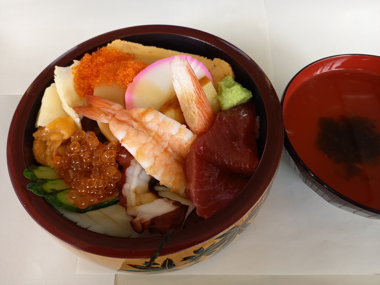 2ヶ月振りの氏金です。今回も出前での利用でした。今回は初めてちらし寿司をいただきました。ちらし寿司の具は、タケノコ、玉子、カニかま、ウニ、イクラ、イカ、タコ、蒸しエビ、マグロ、とびこ等々いっぱいで華やかでした。また、酢飯の上には刻みノリがちらしてあり、風味が良かったです。ちらし寿司お勧めです。