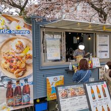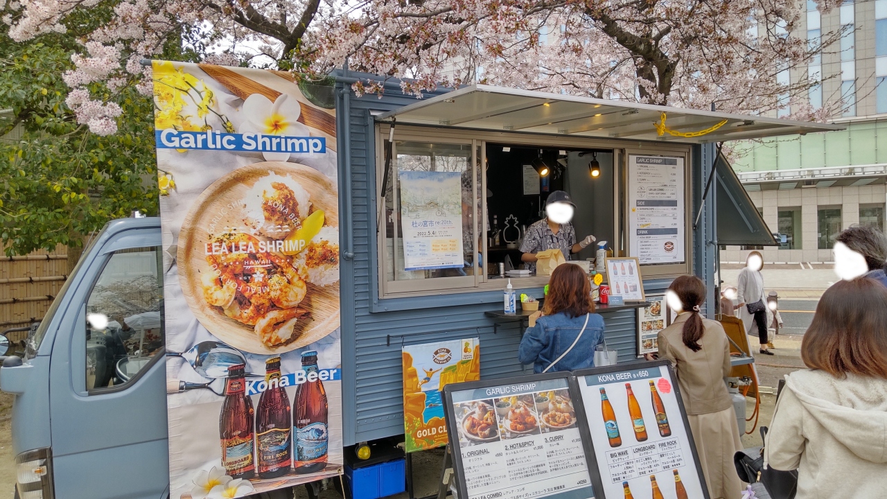 LEA LEA SHRIMPというハワイで有名なガーリックシュリンプのお店が来ていたので、購入し桜満開の中食事が取れました。