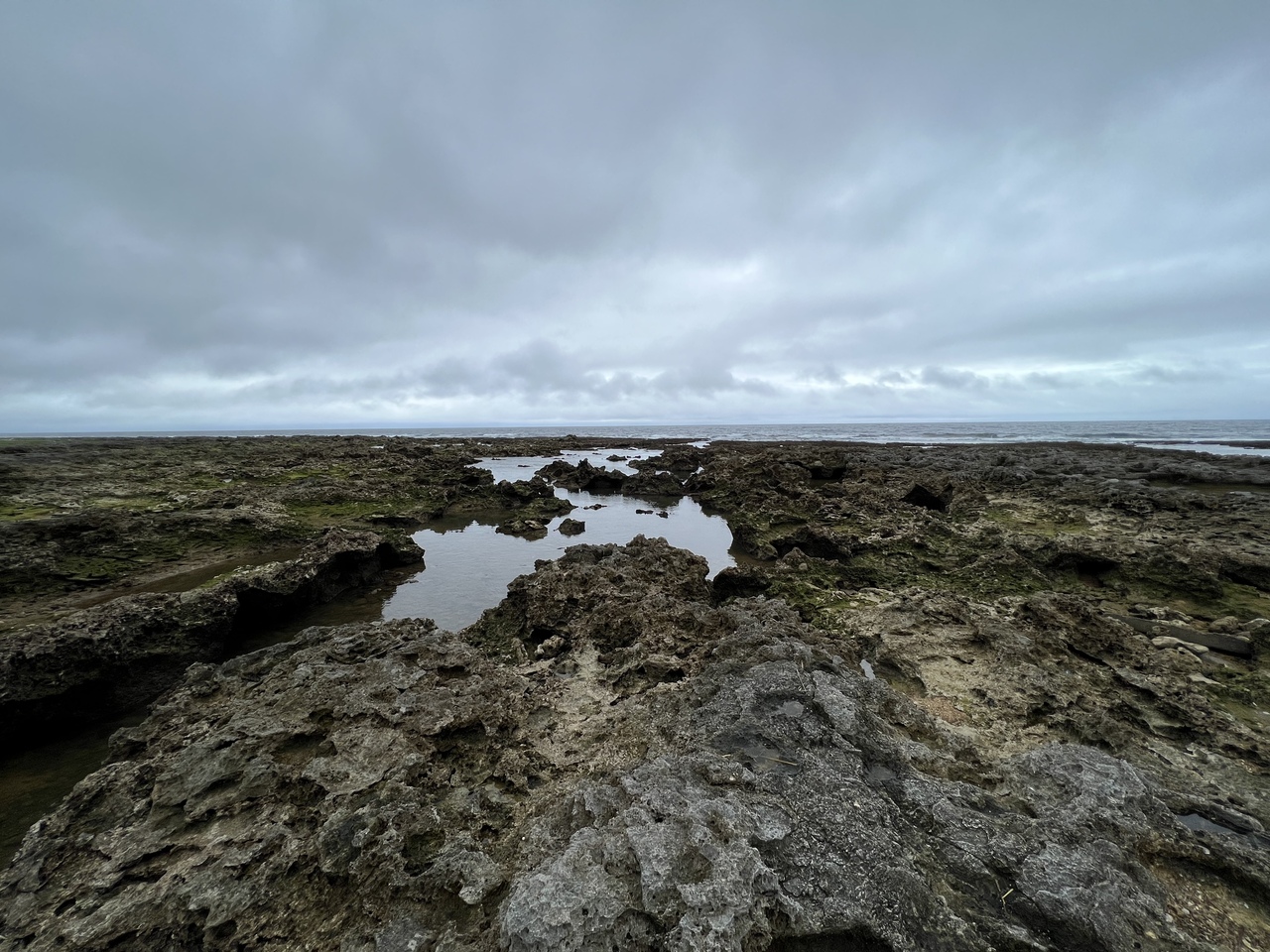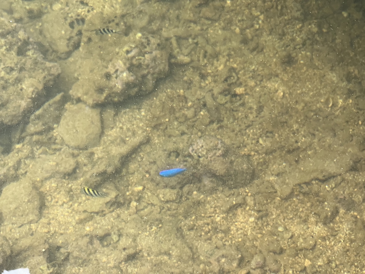 多くの磯だまりがあり、そこに熱帯魚がいるということでした。行ってみると、磯だまりはありますが、全てのところに魚がいるわけではなく、やはり海と繋がっているところに少しだけ見られました。とにかく切り立った岩だらけなので転んだら危険です。十分注意する必要があると思いました。