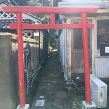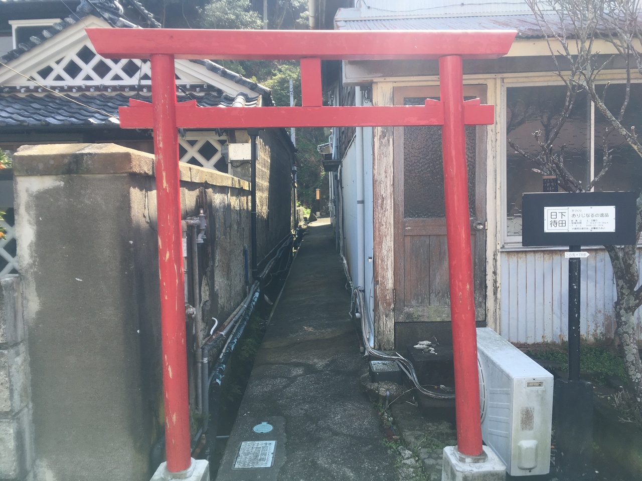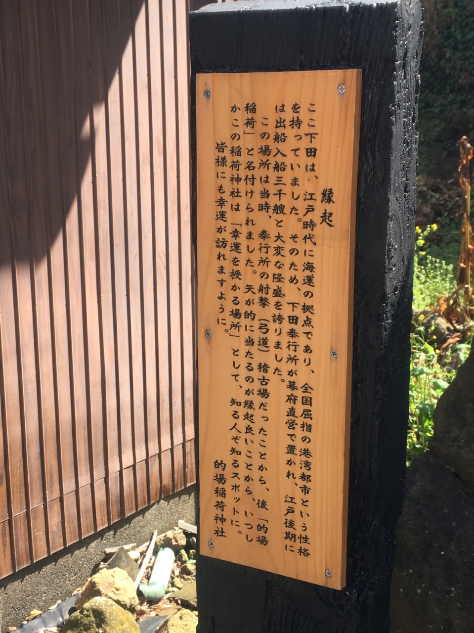 伊豆急「下田駅」から徒歩で10分ほどです。ペリーロードの東端、橋を渡って旧澤村邸の前をさらに進むと民家の前に朱の小さな鳥居が立っています。狭い路地を抜けると民家の裏には小さな社が祀られています。その昔、ここには侍が弓矢の腕を磨く道場があったとか。的場稲荷神社の名の由来です。