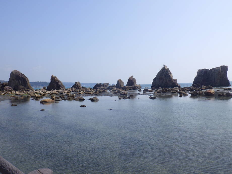 道の駅「くしもと橋杭岩」から「橋杭岩」が綺麗に連なっているようすを見ることが出来ました。道の駅の二階が展望室になっていて、「橋杭岩」について学んだり、テラスから「橋杭岩」を眺めることもできました。弘法大師と天の邪鬼が橋を架ける競争をしたという伝説もあるそうです。