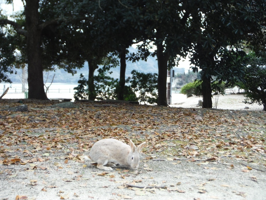 春休みに大久野島に行きました。フェリー乗り場から休暇村行の無料バスも出ています。春休みだけあって平日でしたが人も多く、すでにキャベツや固形のウサギの餌が多く置かれていました。休暇村の前の芝生は穴だらけでウサギに目を奪われすぎていると足を取られそうになります。