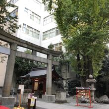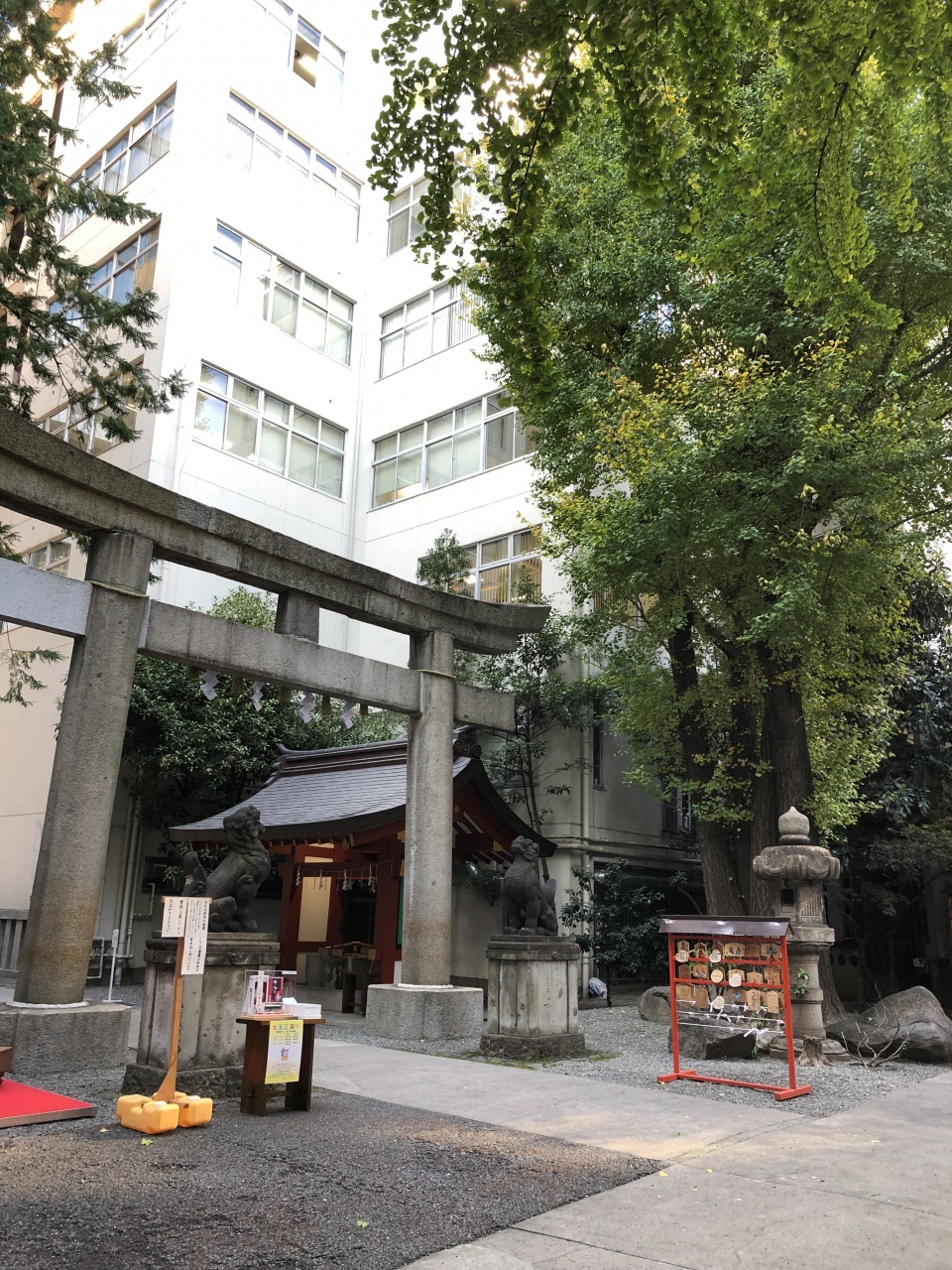 摂社とあるので小規模なものを想像していたのですが、実際行ってみると、緑豊かな木々が茂る思っていたより広い境内の神社でした。都会の真ん中にあって、緑の多い静かな空間はほっとします。月並みな言葉ですが、都会のオアシスですね。