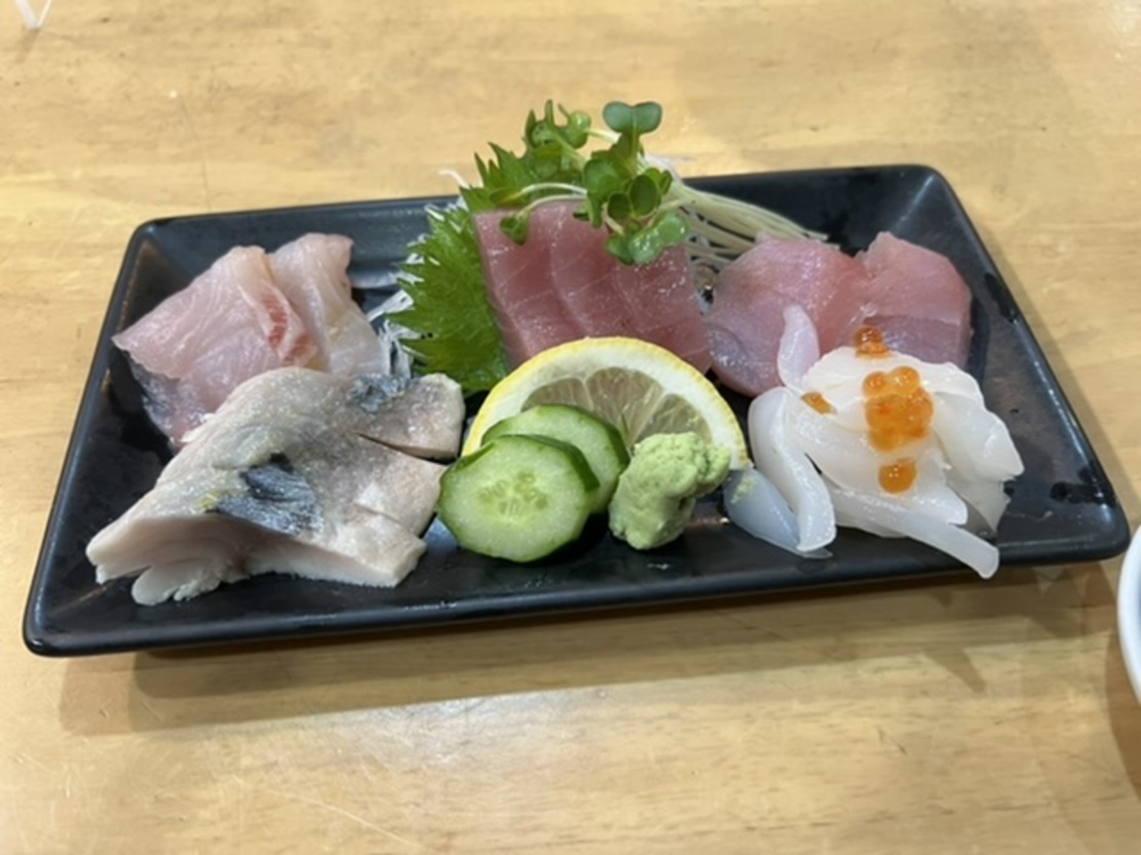 先ずはオリオン生ビール!刺身盛合せ、そして泡盛1合は白百合で。もずく天はサクサクで美味しい。