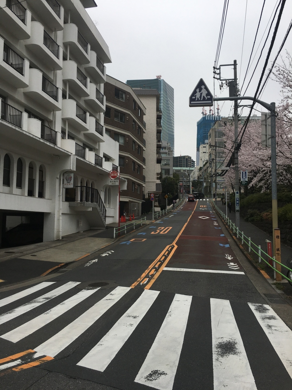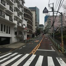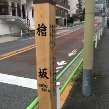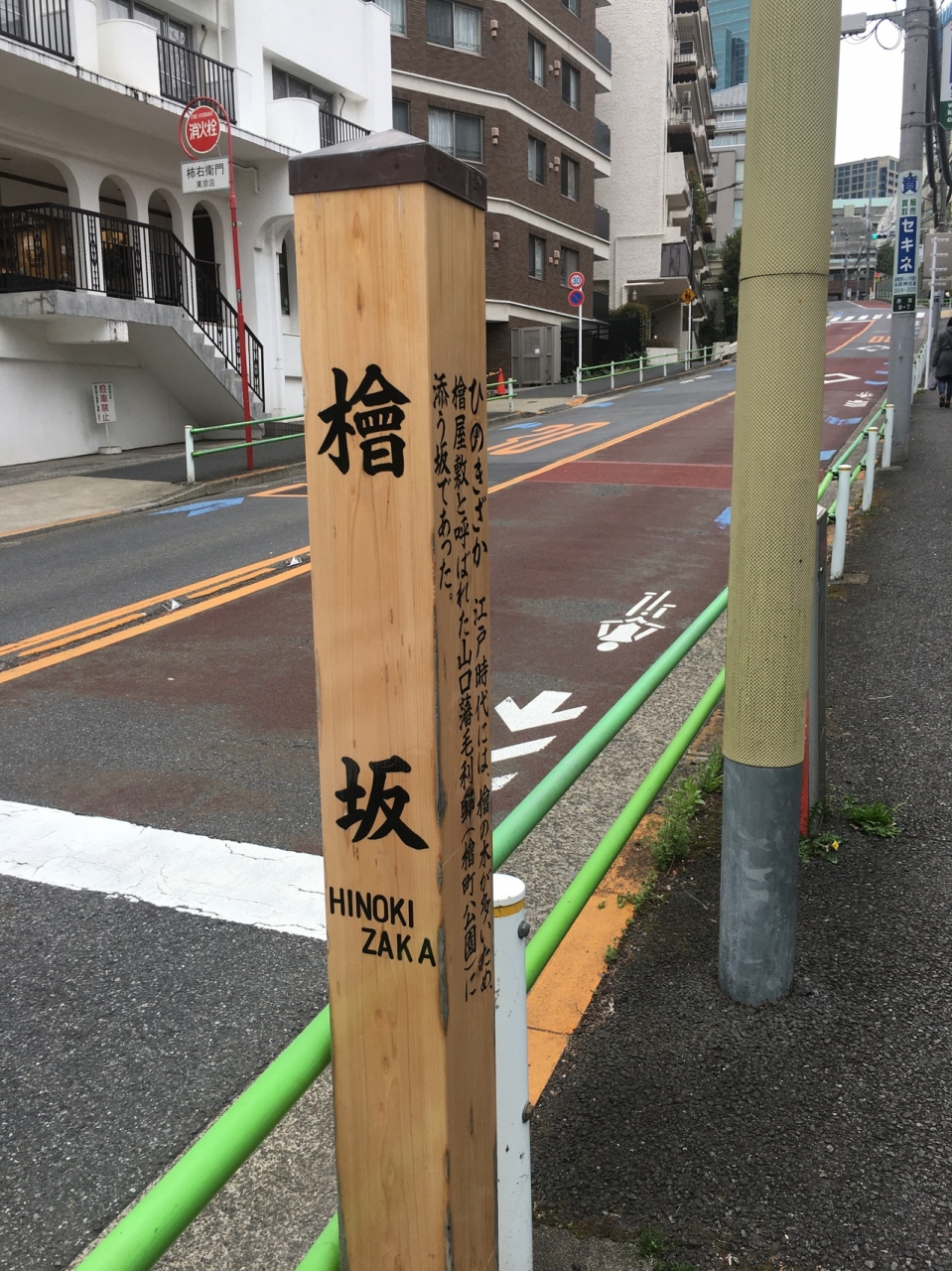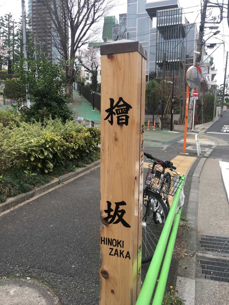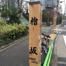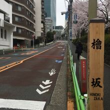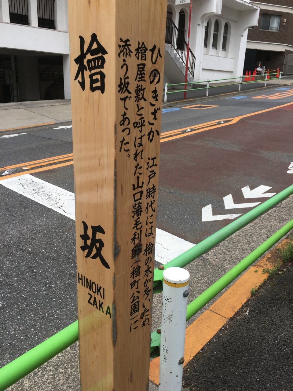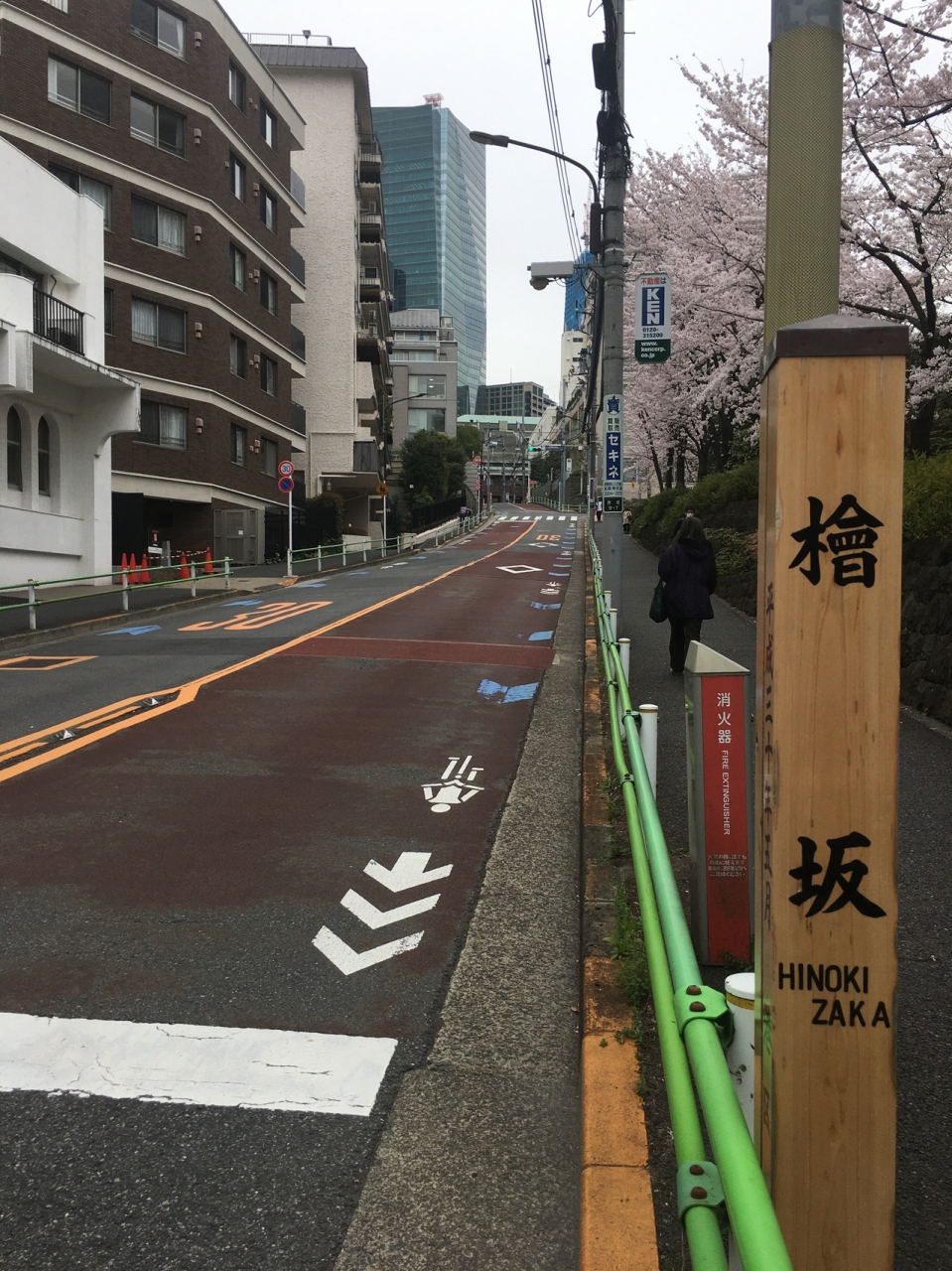 江戸時代には檜の木が多かったため、この名称で山口藩毛利邸に沿う坂でした。緩やかな坂で現在は桜の木があり訪問時は満開で、マンション等が並んでいる一直線の坂道でした。自動車も少なく坂の左右は歩道になっています。