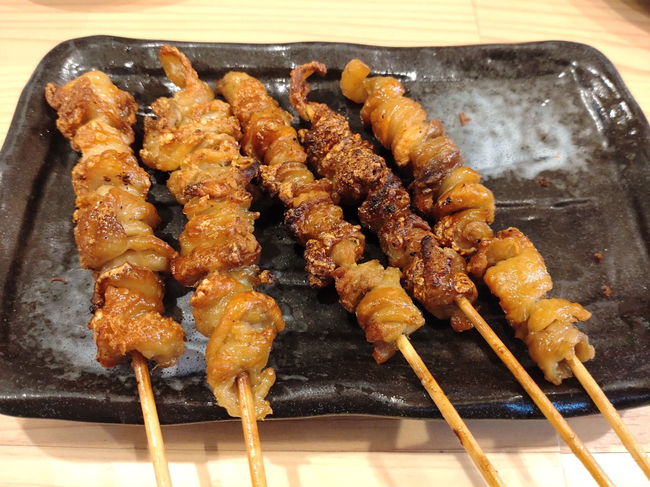 「竹乃屋」の名物といえば、「ぐるぐるとりかわ串」。東京で食べる焼鳥の鶏皮とは異なり、首の周りの皮を串にぐるぐる巻き付けて、焼いては寝かせてを繰り返しながら秘伝のタレを染みこませていったもの。外はカリカリ、中はもちっととした、これまでにあまり食べたことのない食感で、お酒にもヒールにも合う味。普通の鶏皮が苦手な人でも食べられるかも。