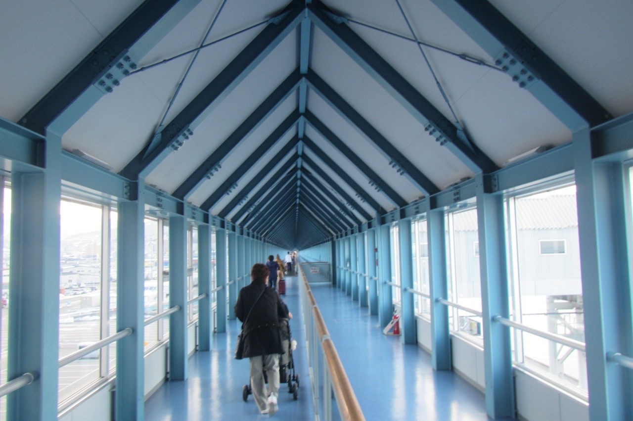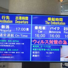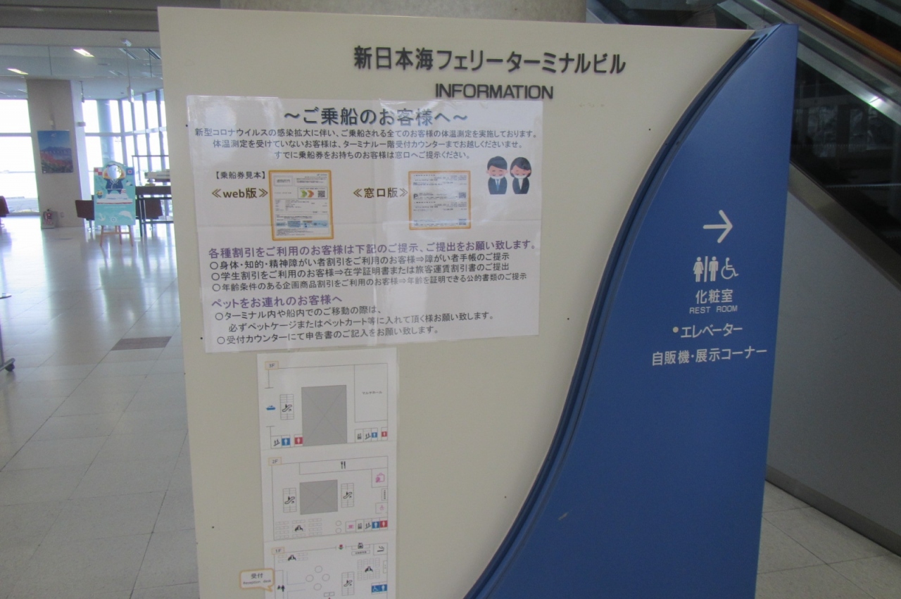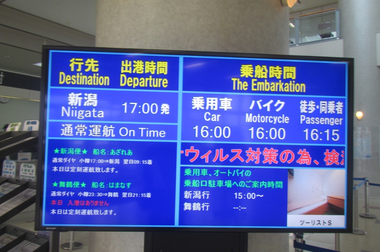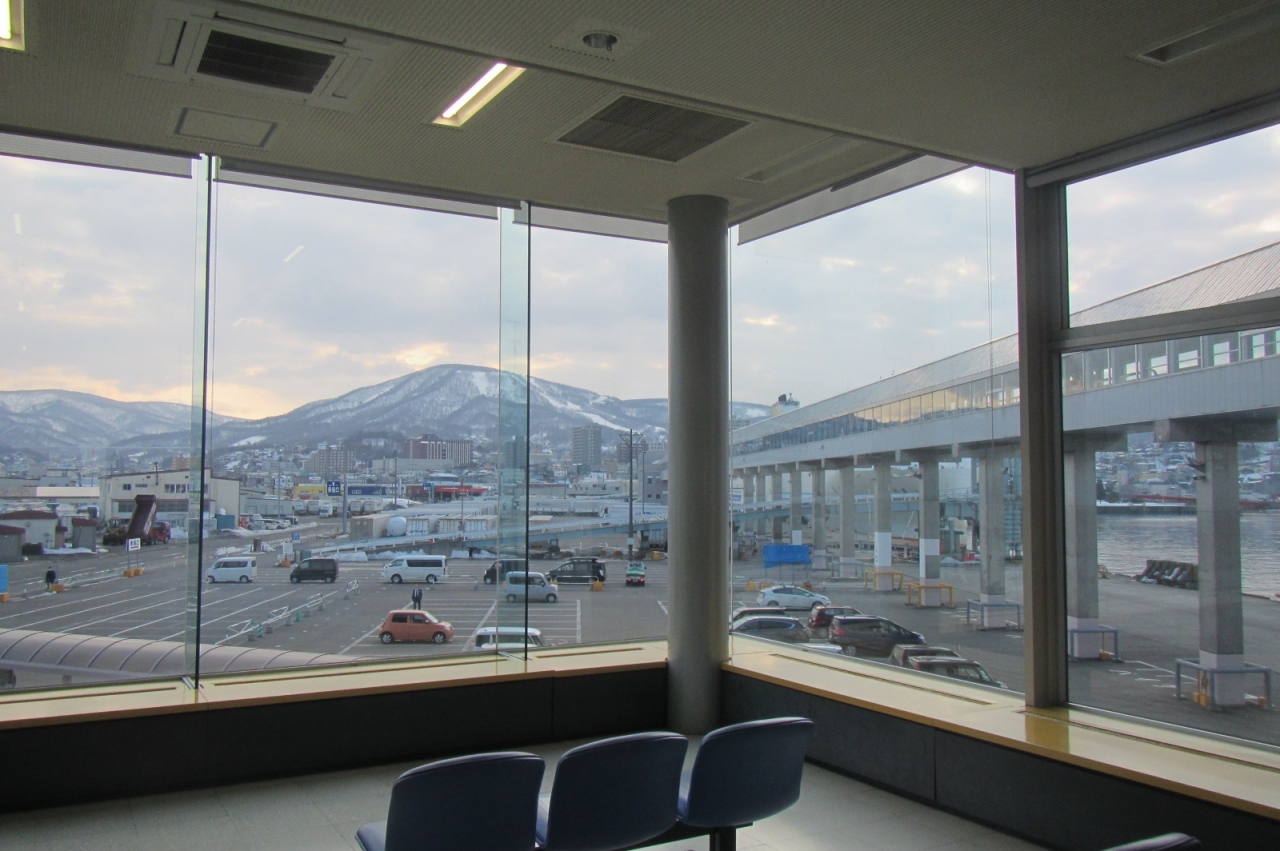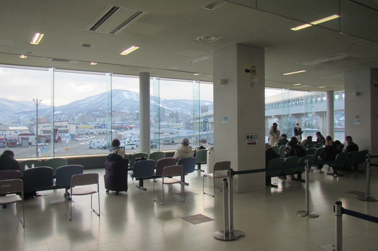 新潟、舞鶴行きなどの新日本海フェリーの船が出ており、ホームページでは乗船者は出港1時間前までの到着が推奨され、30分前に締切りの案内がされていましたが、ターミナル1階受付・券売窓口ではそうなのでしょうが、3階の乗船口では、実際には30分前くらいからようやく徒歩乗船できるようになっていました。
