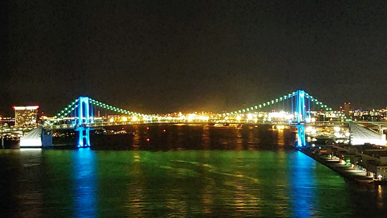 晴れていれば青空と青い海の間に美しい橋の姿が、暗くなってからは煌びやかなお台場方面にライトアップされた橋が映えて絵になります。