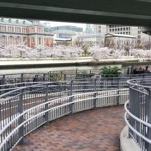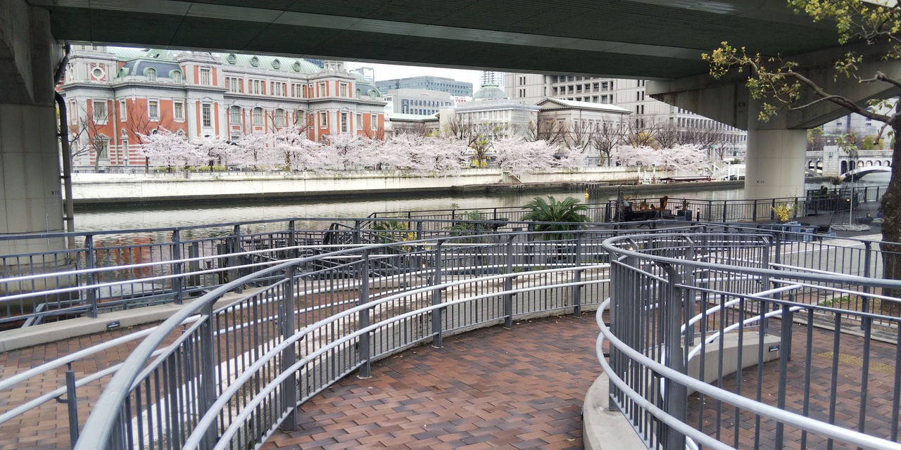 中之島のラブ セントラルは裁判所のすぐ南側にあります。堂島川に面したスペースにあり、水晶橋から鉾流橋の間にあります。4月初めに行きましたので、向かいの大阪市中央公会堂の近くにある桜並木がスゴくキレイでした。