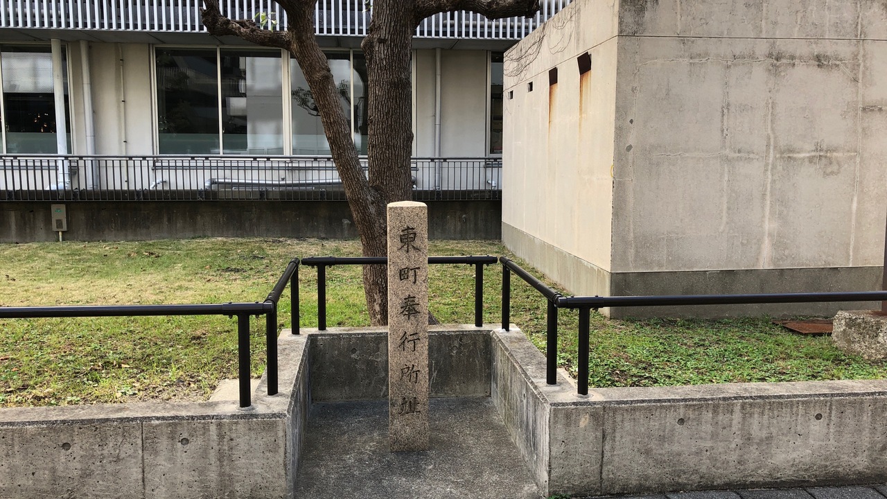 奉行所とは、警察官または裁判官のような役割をする人たちが務めた場所です。大坂には、東町・西町、2つの奉行所がありました。東町奉行所は、ここ、大阪城の西側に、西町奉行所は、本町エリアにありました。どちらも奉行所跡と、石碑が建つのみとなっています。