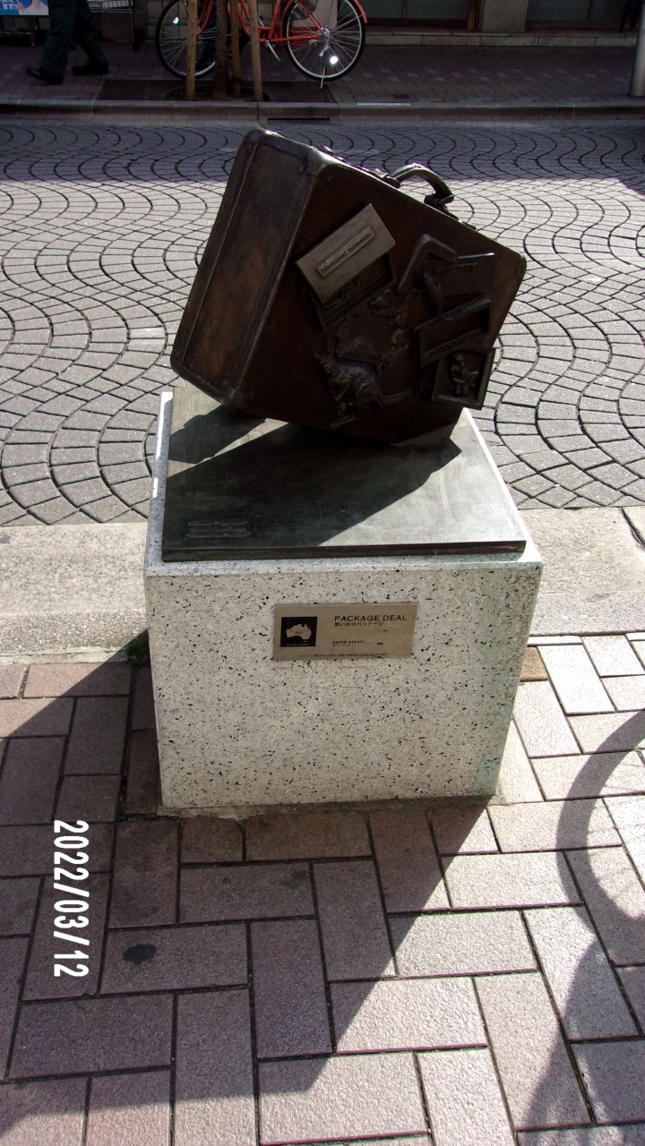 この微笑みのモニュメント・思い出のパッケージは麻布十番通りにある微笑みのモニュメントの一つです。地下鉄麻布十番駅からすぐの場所にあります。この作品は鉄製のオブジェです。カバンが自分の人生とともに一緒にいたのだと思いながらタイトルを見て納得しました。素敵な作品で素敵なタイトルです。
