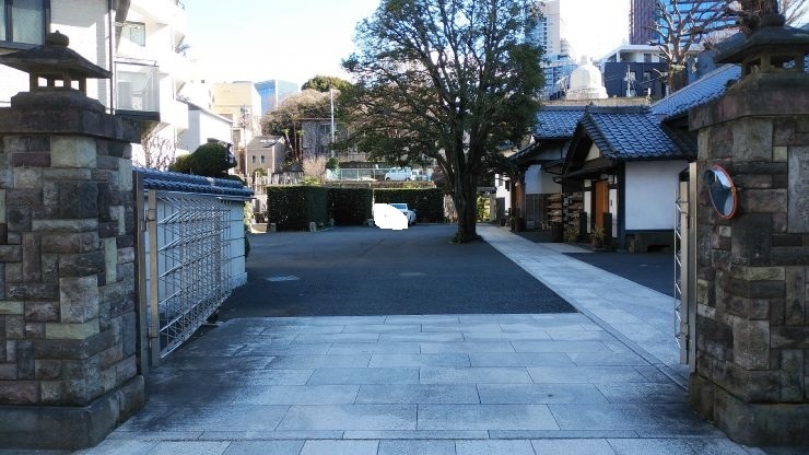桜田通りに面し、広めの境内を有していた。境内はアスファルトの地面で近代的な雰囲気。お寺らしい雰囲気の本堂の建物が建てられていた。奥の方には非公開だが庭園があるようで、緑が豊かな面も垣間見えた。都心部にありながら落ち着いた雰囲気が感じられた。