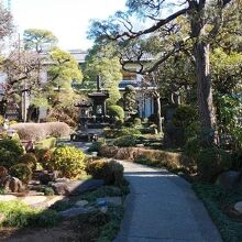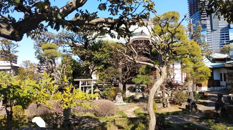 国道から一本入った道路の坂の途中にある寺院で、山門から歴史が感じられる。山門をくぐると緑豊かな庭園が見られ、なかなかの見どころある風景だった。本堂もお寺らしい建物。奥に見える高層ビルとの対比も特徴的だった。