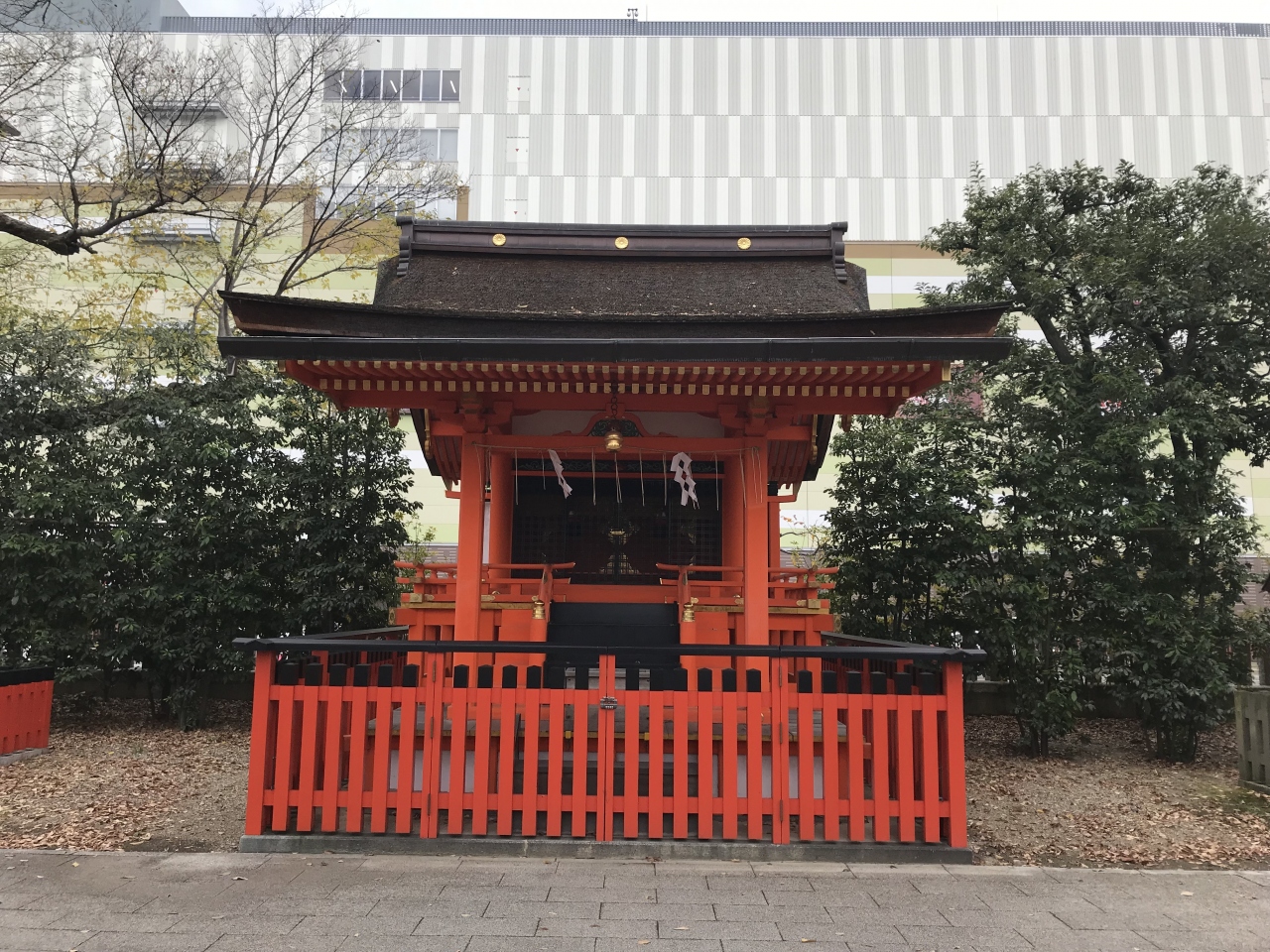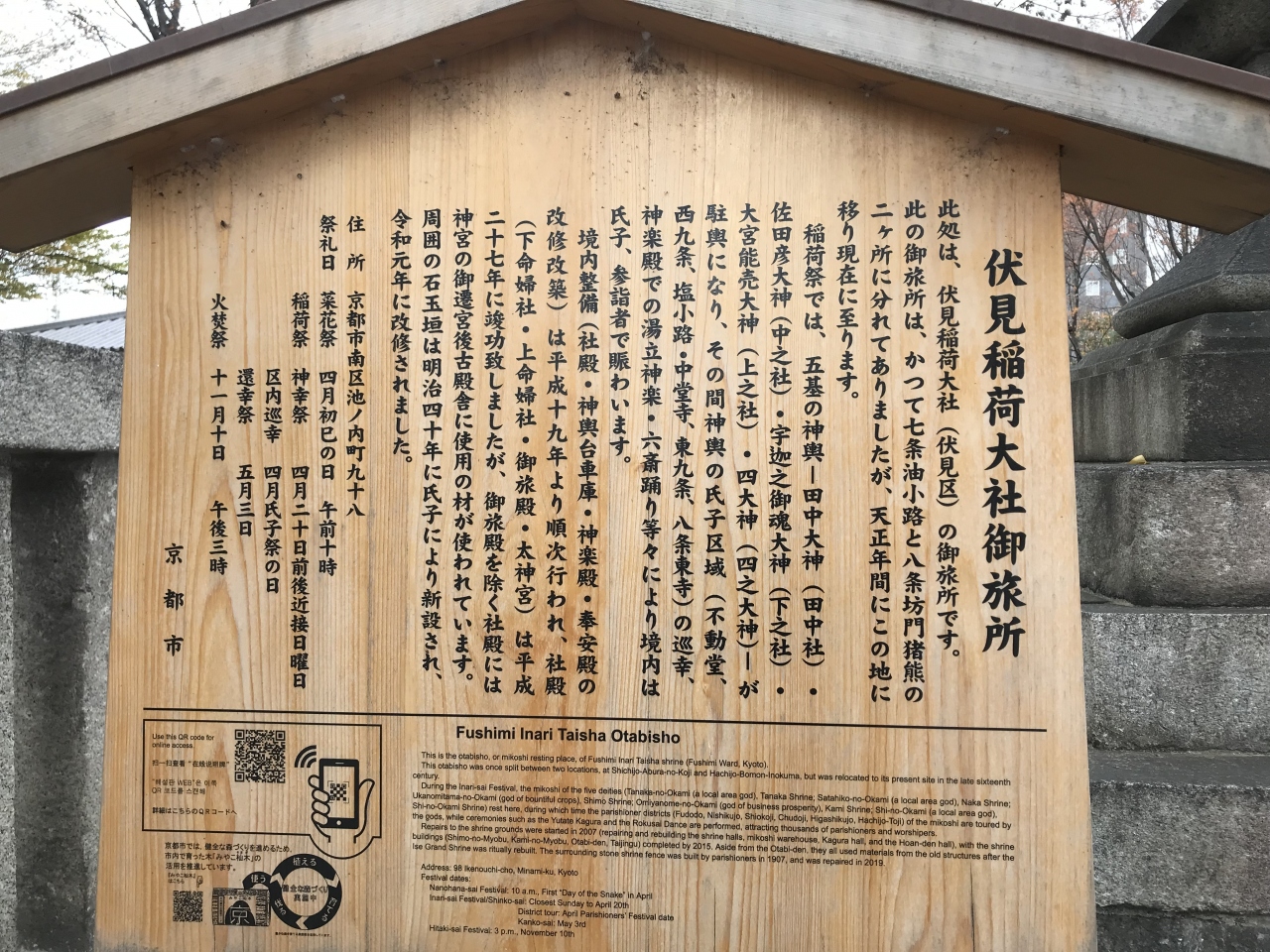 伏見稲荷大社御旅所は、JR京都駅から徒歩7分くらいで、国道1号線沿いにあります。御旅所とは、神幸祭(伏見稲荷大社では稲荷祭)のときに神輿が一休みする場所とのことです。稲荷祭は4~5月にあり、伏見稲荷大社と御旅所の間を、いくつもの神輿が移動するそうです。「稲荷祭」の期間にはここも一変し、連日氏子の人々で賑わうそうです。朱色の大きな鳥居があり、境内は広い敷地です。片隅にはこれまた朱色の立派な社もありました。私が訪れた際にも私だけで、普段は静寂な御旅所でした。