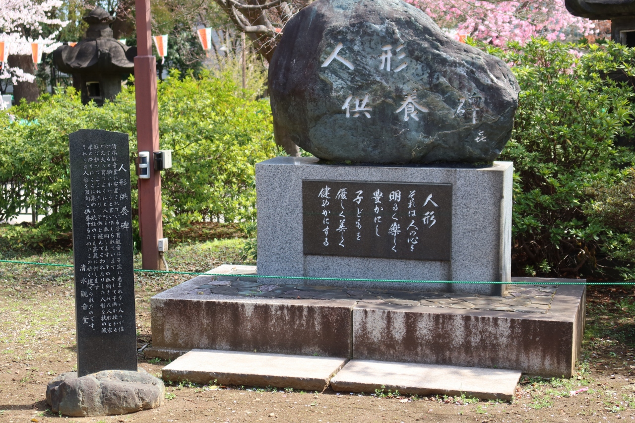 上野公園の中にある清水観音堂の入口すぐ右手に人形供養があります。毎年9月25日には子育て観音に祈願し、成就した人が奉納した人形が置かれ人形供養法要が行われることで知られています。