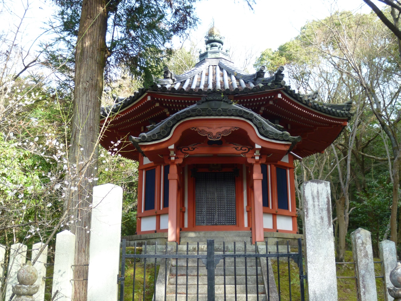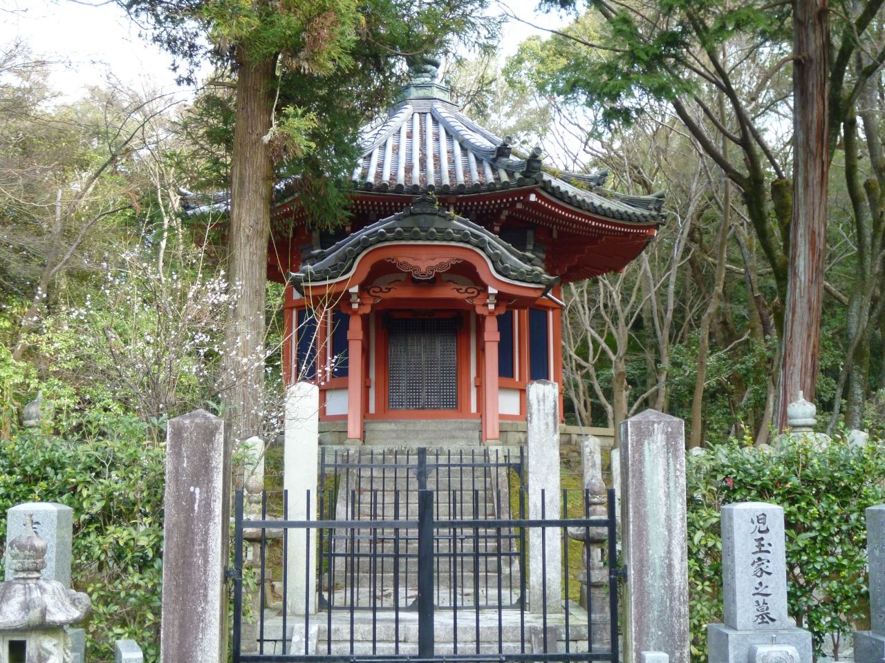 最勝金剛院は、東福寺の西にある塔頭。九条家の墓を管理するために再興された東福寺の特別由緒寺院。墓所の奥に佇む八角堂が九条兼実の廟所です。廟所には立ち入り禁止用の鉄柵が設けられていました。朱色、白、黒のコントラストとデザインがすばらしい建物です。九条兼実は、藤原氏から分かれた五摂家の一つである九条家の祖として知られる公卿。子孫から一条家、二条家が分派しています。晩年の兼実は、現在の東福寺付近に営まれた月輪殿という山荘に隠棲し、亡くなったそうです。私が以前こちらを訪れた際には、猿と遭遇しましたので気を付けて参拝してください。