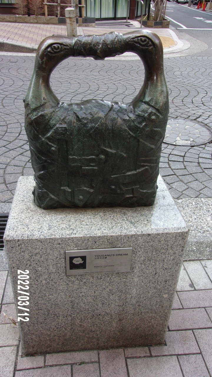 この微笑みのモニュメント・ユガヌの夢は麻布十番商店街にあります。地下鉄麻布十番駅から5分程度です。始めた見たときに人が頭の上で手を組んでいるような印象を受けました。ユガヌのことがわからずさらに夢のイメージも感じられませんでした。今でも人の動作を意識しています。