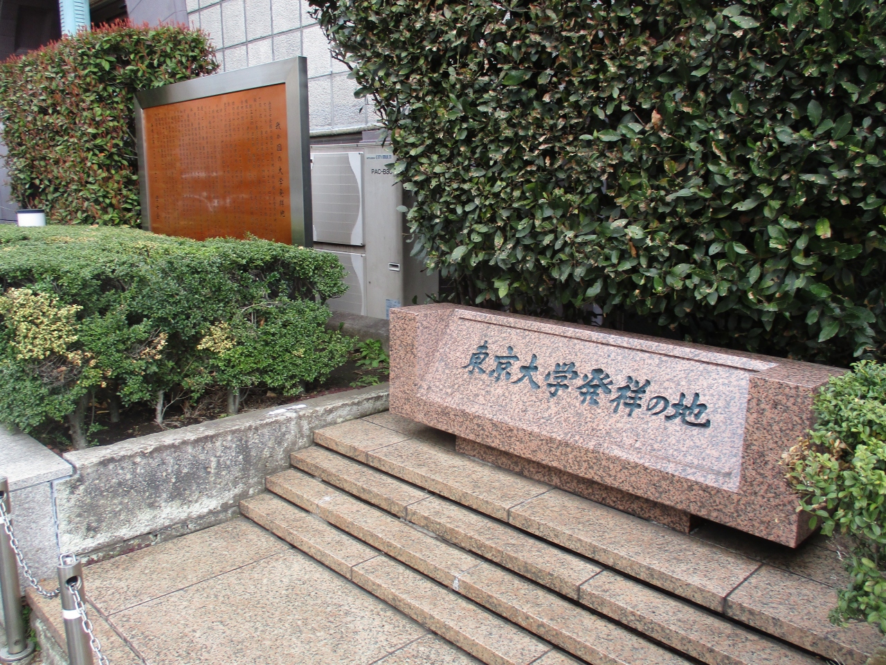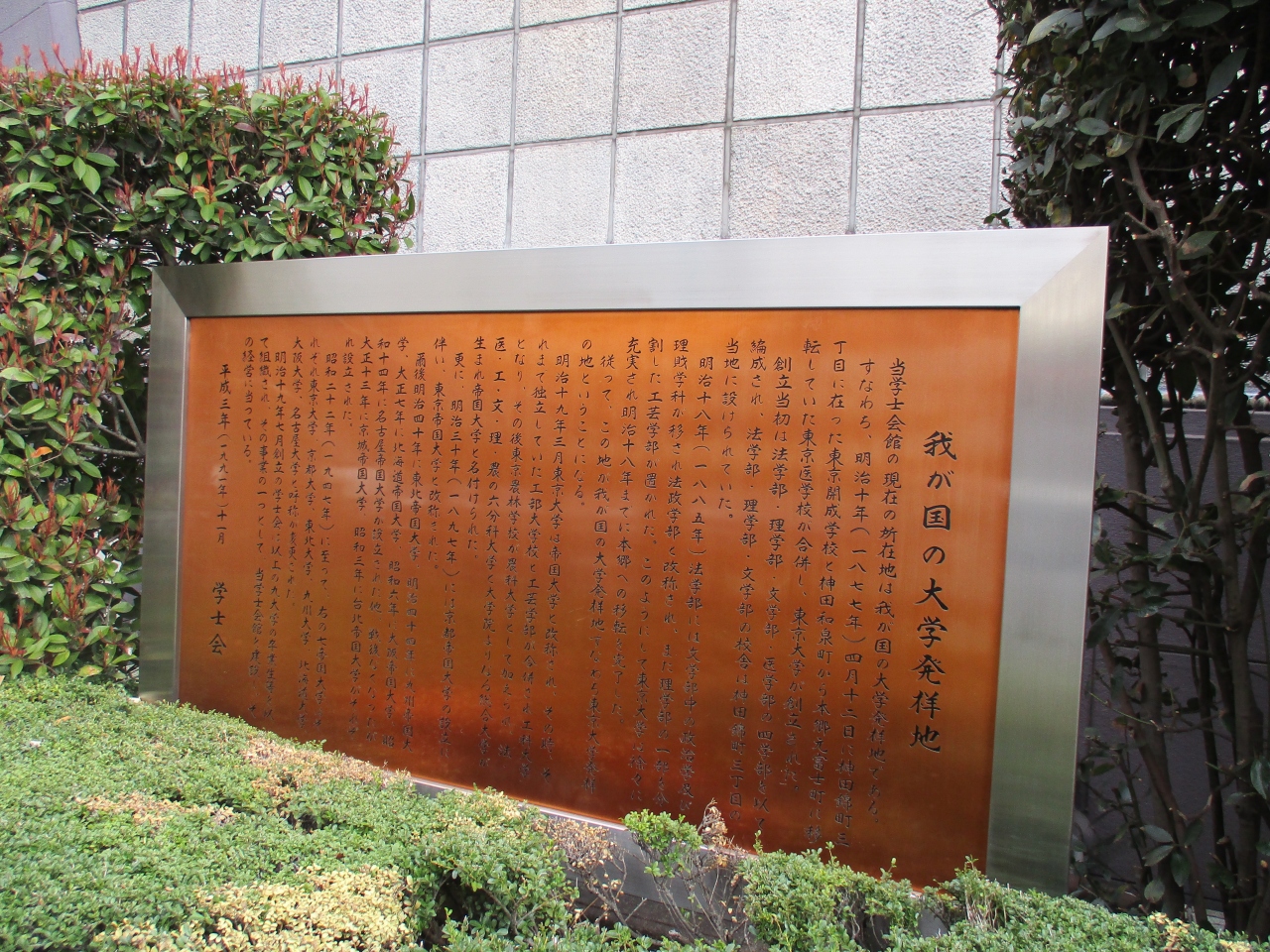 神田錦町付近を散策中に、学士会館の敷地内にある石碑が目に留まったので立ち寄りました。東京大学発祥の地と刻まれた石碑でした。東京大学は赤門で知られている本郷が発祥の地だとばかり思っていましたので、この場所だったとはとても意外に思いました。