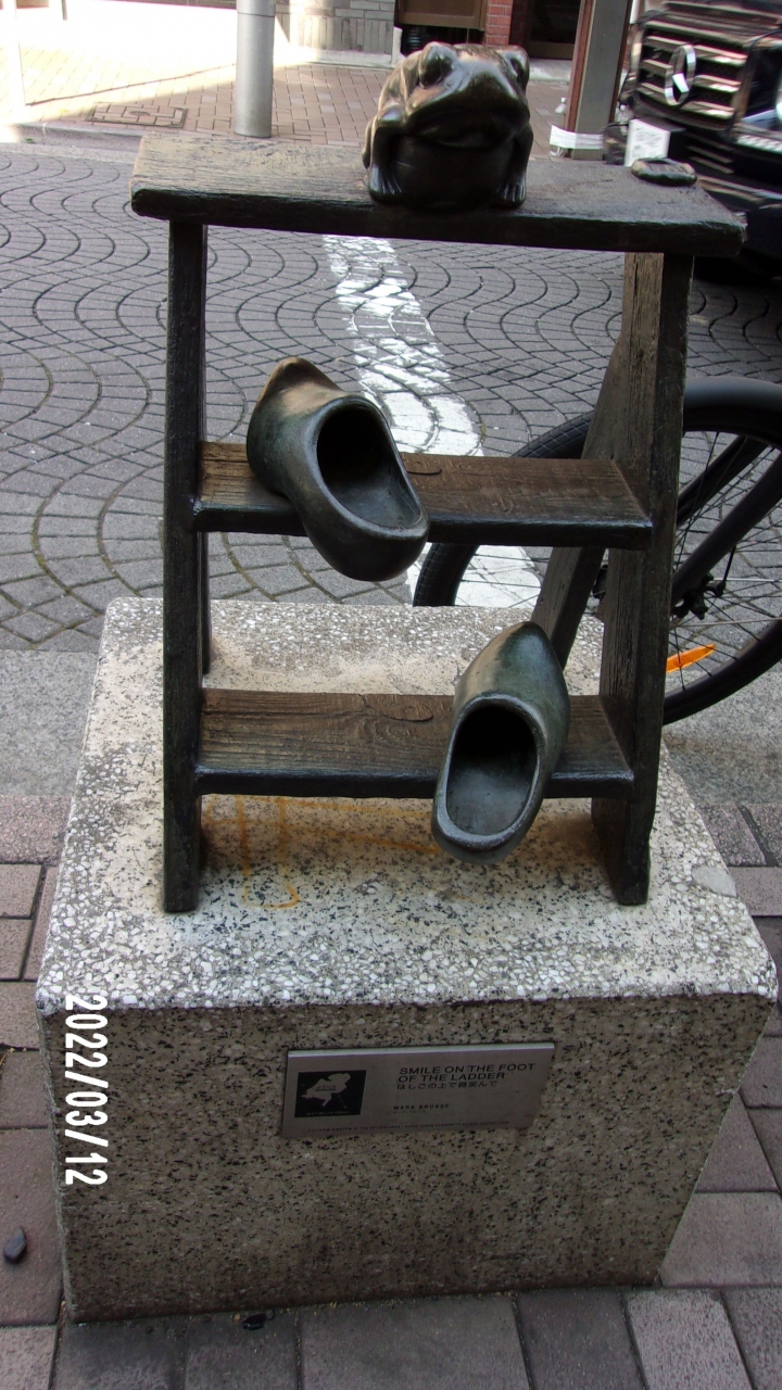 この微笑みのモニュメント・はしごの上でほほえんでは麻布十番商店街にあります。地下鉄麻布十番駅から5分ていどです。この梯子をモチーフにしたユニークのオブジェは歩道とマッチしていています。歩いていて気づかずに通ってしまいます。微笑むのはおとなでなく子どもの方がよりマッチしているのです。子どもに夢をまたせるオブジェです。