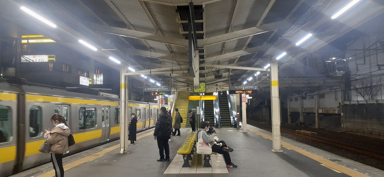 快速電車は通過し、黄色い普通電車のみの駅です。