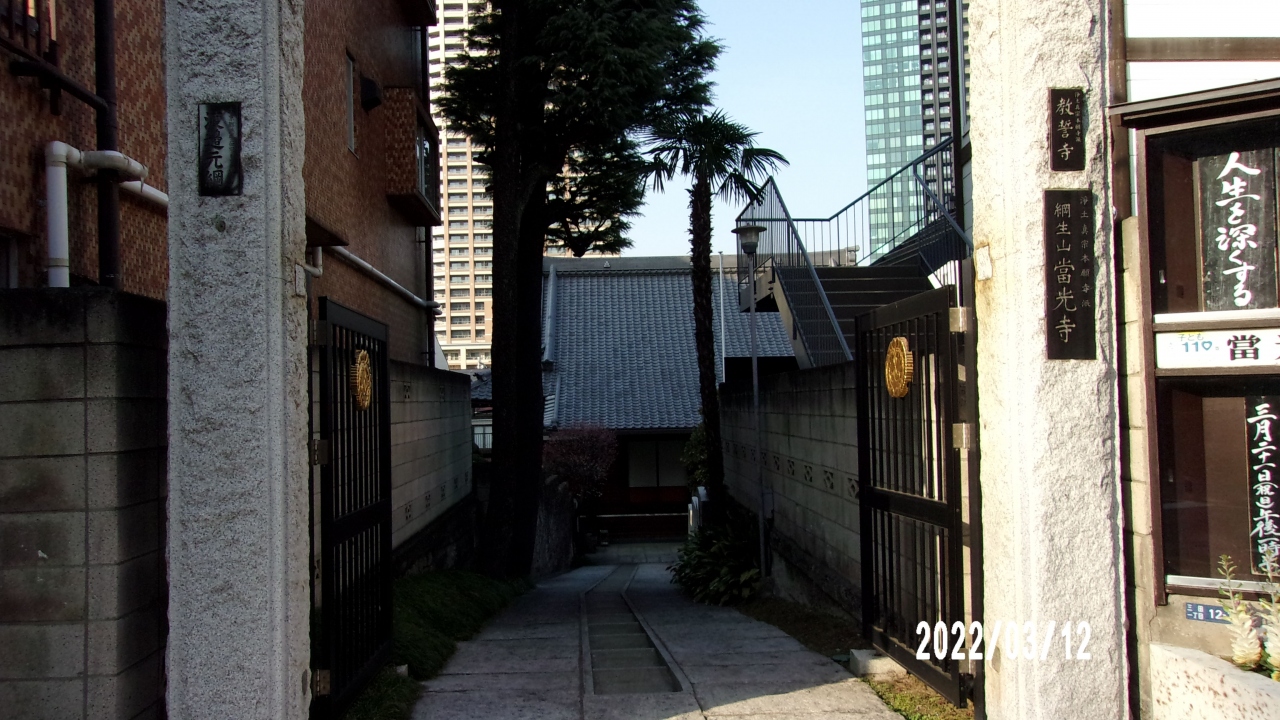 この當光寺は三田の日向坂の途中にあります。地下鉄東京メトロ南北線麻布十番駅から南東に5分強の場所にあります。この寺は創建は不明です。最初は真言宗でしたが麻布の善福寺が浄土真宗に改宗したから16世紀中ごろに今の浄土真宗本願寺派に改宗しています。山門から下ると本堂があります。その間に教誓寺があるのです。山門の石柱にも名称が掲げられているのです。