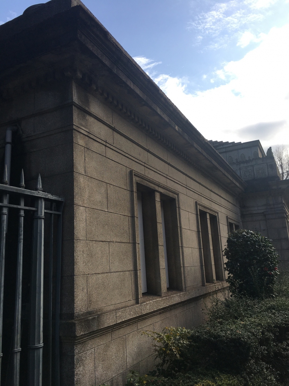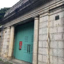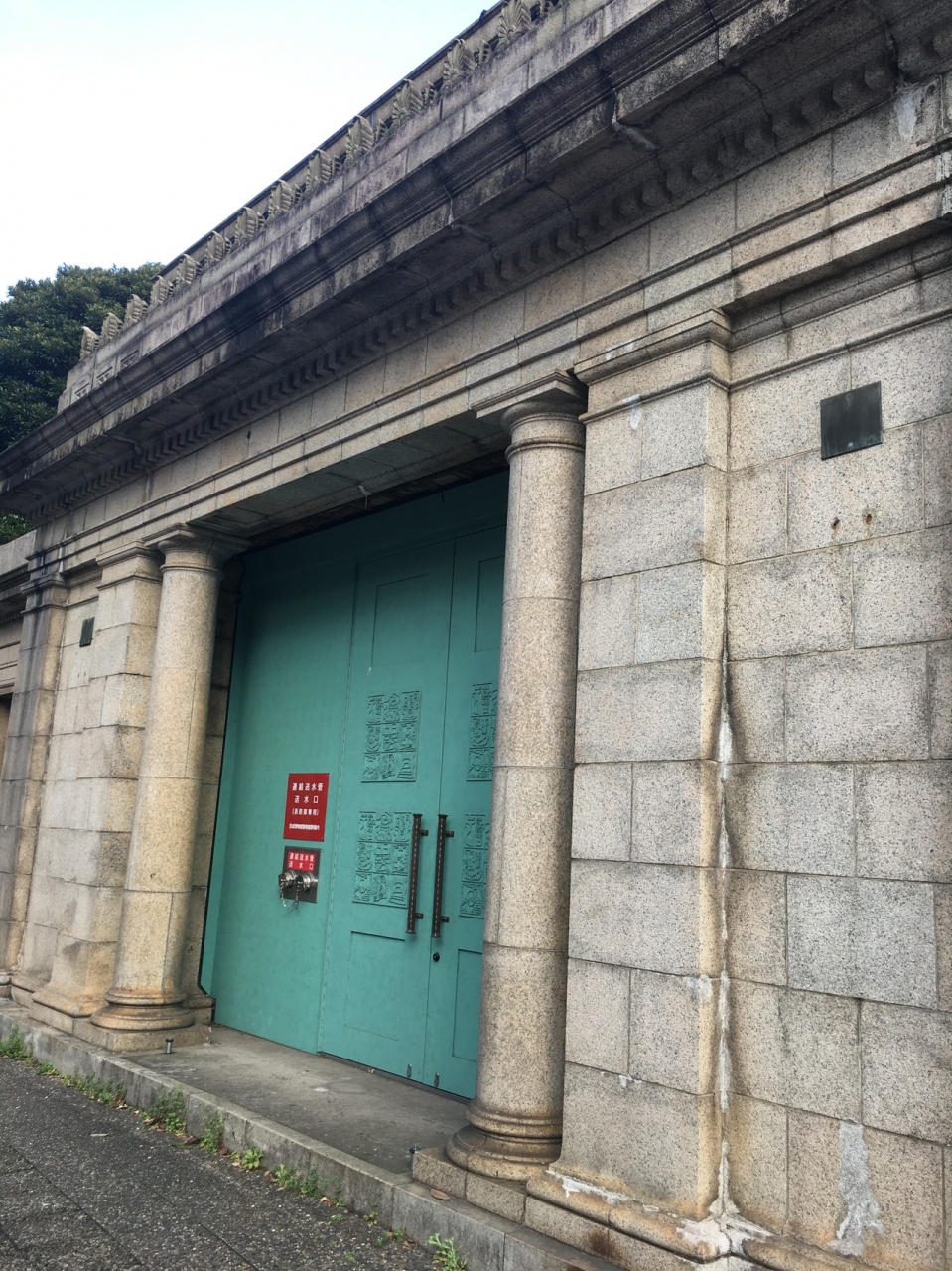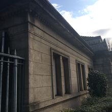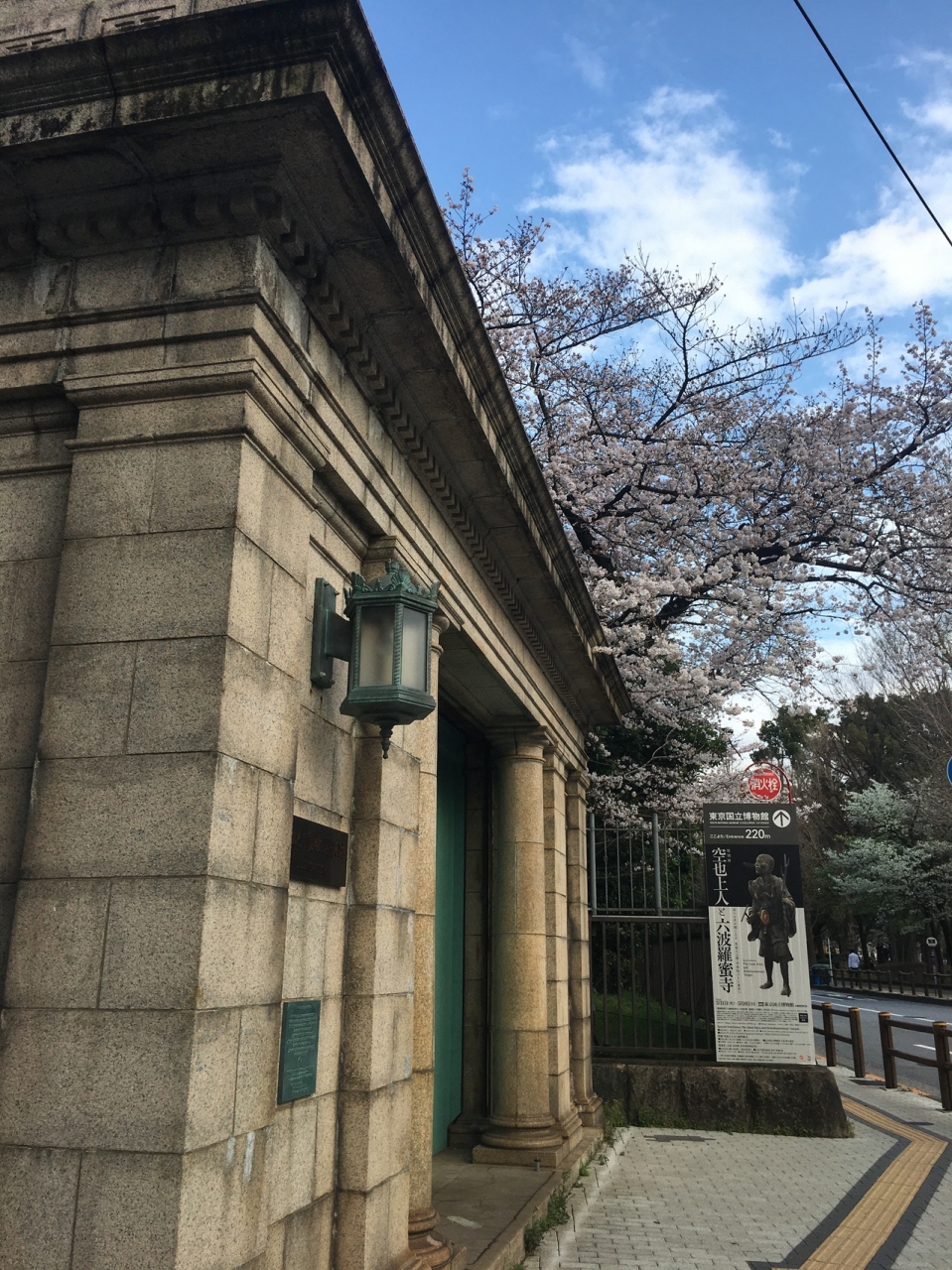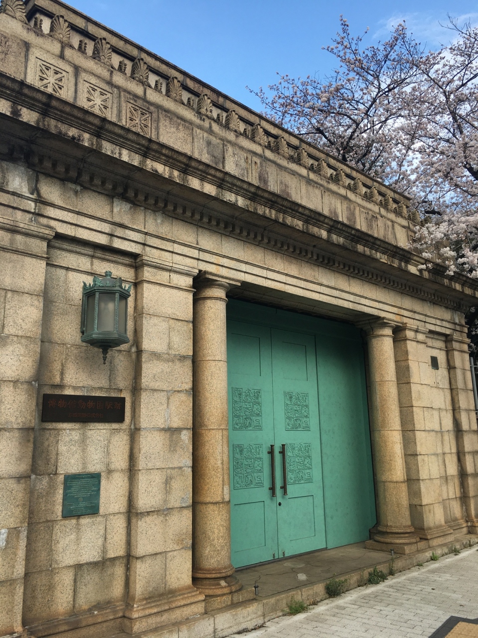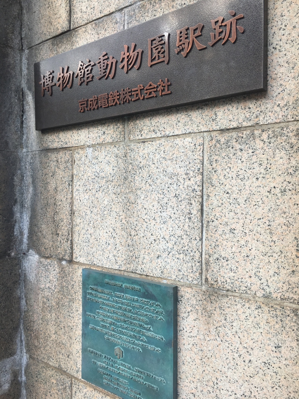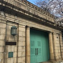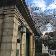 交差点の角に重厚感ある建物があり、京成電鉄の駅跡でした。駅には見えない外観で博物館や美術館に見えました。扉も頑丈でした中に入ることは出来なかったですが、とにかく頑丈な作りでした。横の桜が駅舎跡に垂れ下がり見事でした。