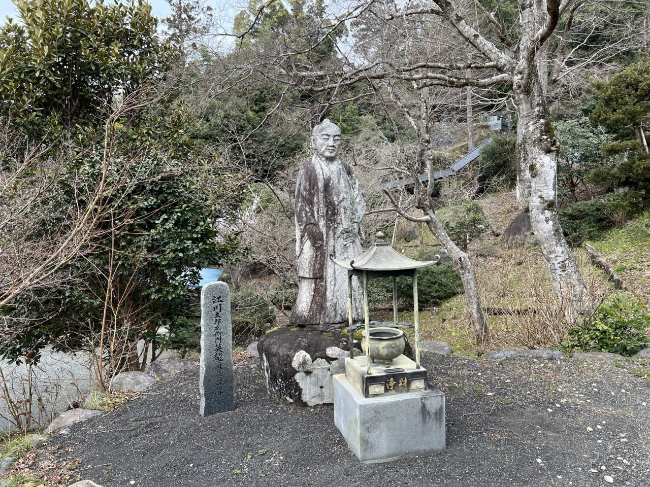 中伊豆屈指の観光スポット江川邸から、裏山に向かって7-8分歩いたところに、江川家の菩提寺、本立寺があります。江川家16代当主、江川英親公が日蓮聖人をこの地に招いて開基したお寺で、参道には江川英親公の等身大の石像があります。本堂の奥にある墓苑には、江川家代々の墓碑が何段にも並んでいます。