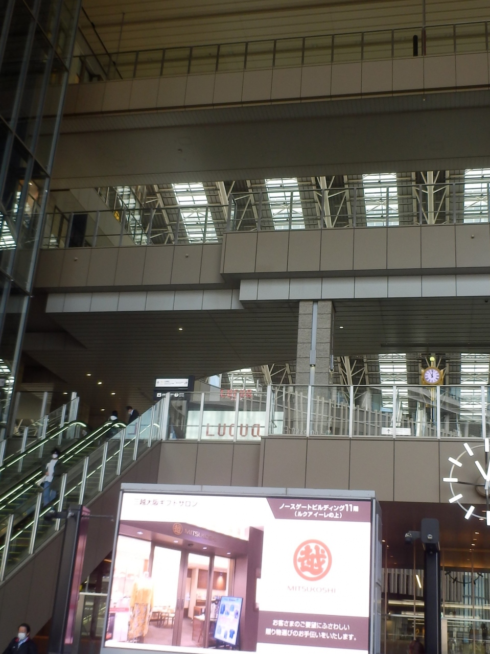 JR大阪駅二階連絡口改札と同一階中央コンコースから阪急電鉄梅田駅やグランフロント大阪の結節点になる広場、人は交錯しており待ち合わせ場所とし不人気になってきた、ノースゲートビルの二階に当たるので雨天は凌げるが吹きさらし、分かりやすい場所です