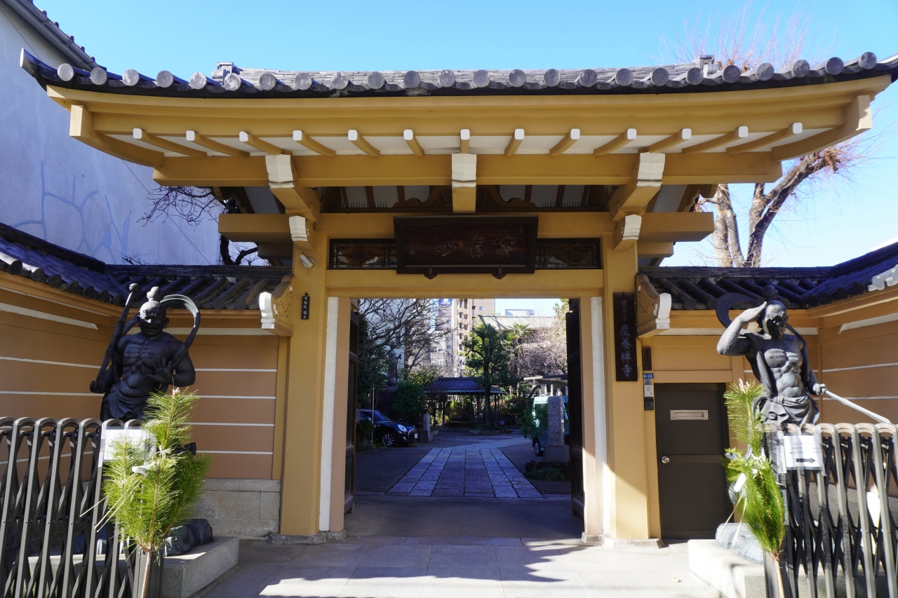慶養寺は、江戸時代前期、浅草蔵前に創建し、その後当地に移転してきた曹洞宗の寺。塀に四本の白い線が入っているのは格式が高いことの証です。山門の両側に仁王像が建っていて、ちょっとした威圧感。仁王門に変えた簡素なしつらえかと思います。